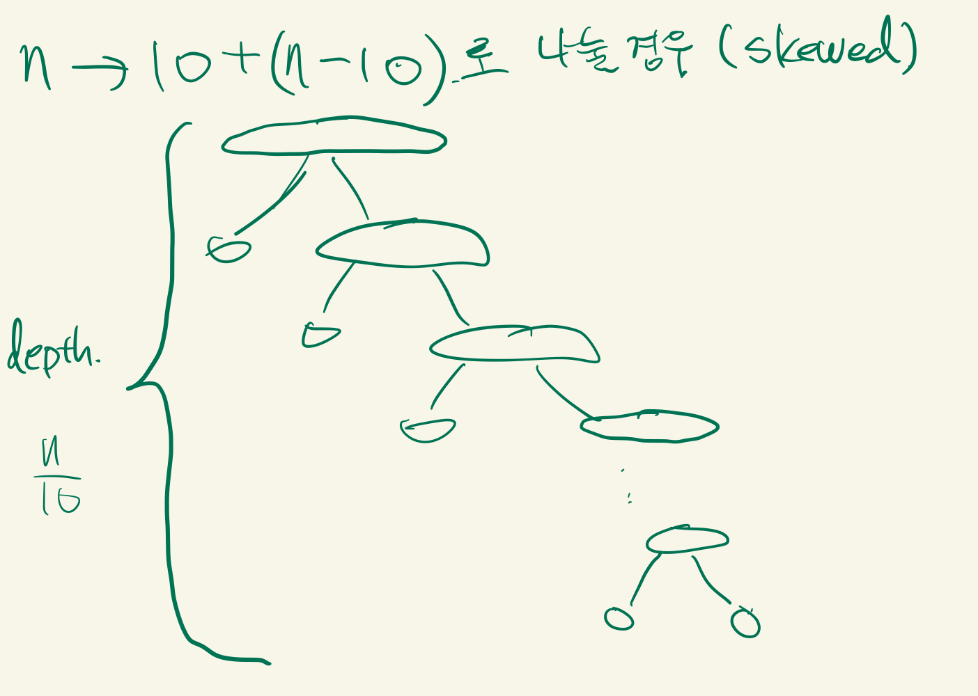 만약에 merge sort에서 n을 10 과 n-10으로 나누어서 계산한다면 트리의 깊이가 n/10이 되므로 시간복잡도는 O(n^2)이 될 것이다.