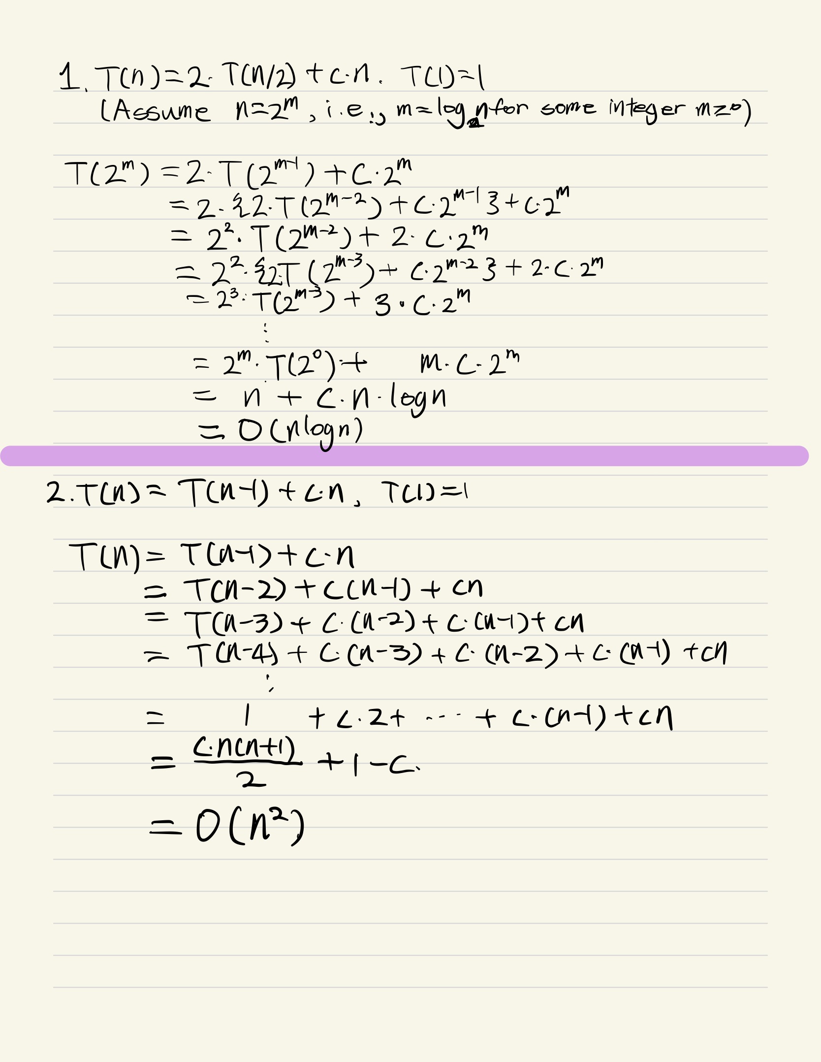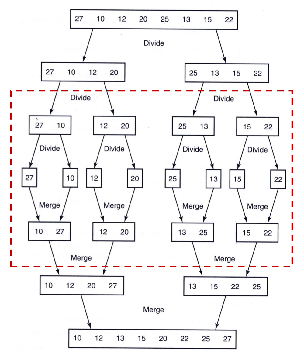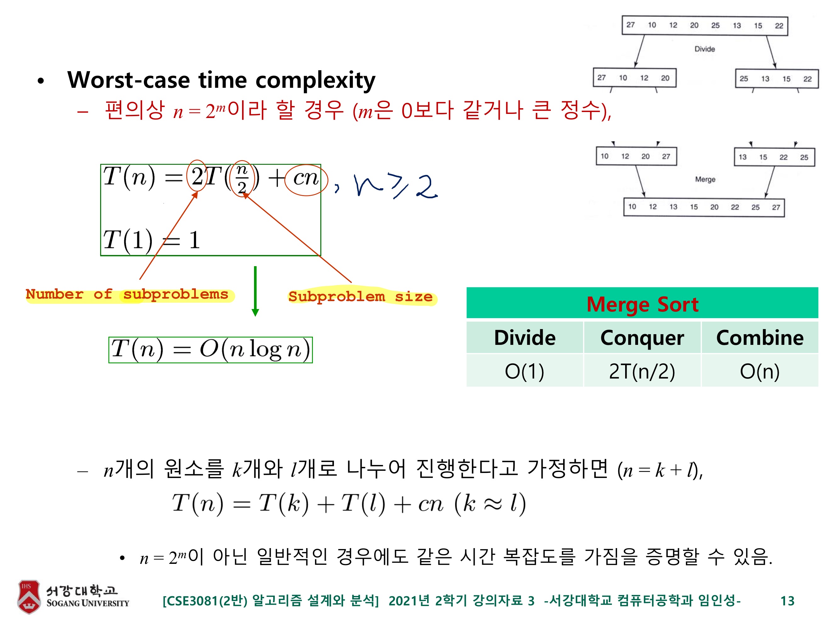Conquer - 각각의 subarray를 recursive하게 sorting한다. T(n) = 2T(n/2)+cn