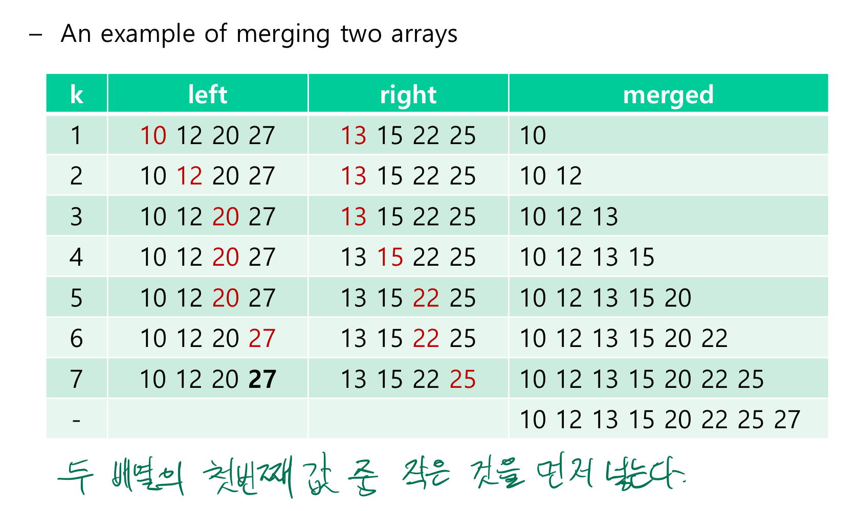 Combine - 각각의 subarray를 merge하면서 sorted array로 바꿔준다. O(n)