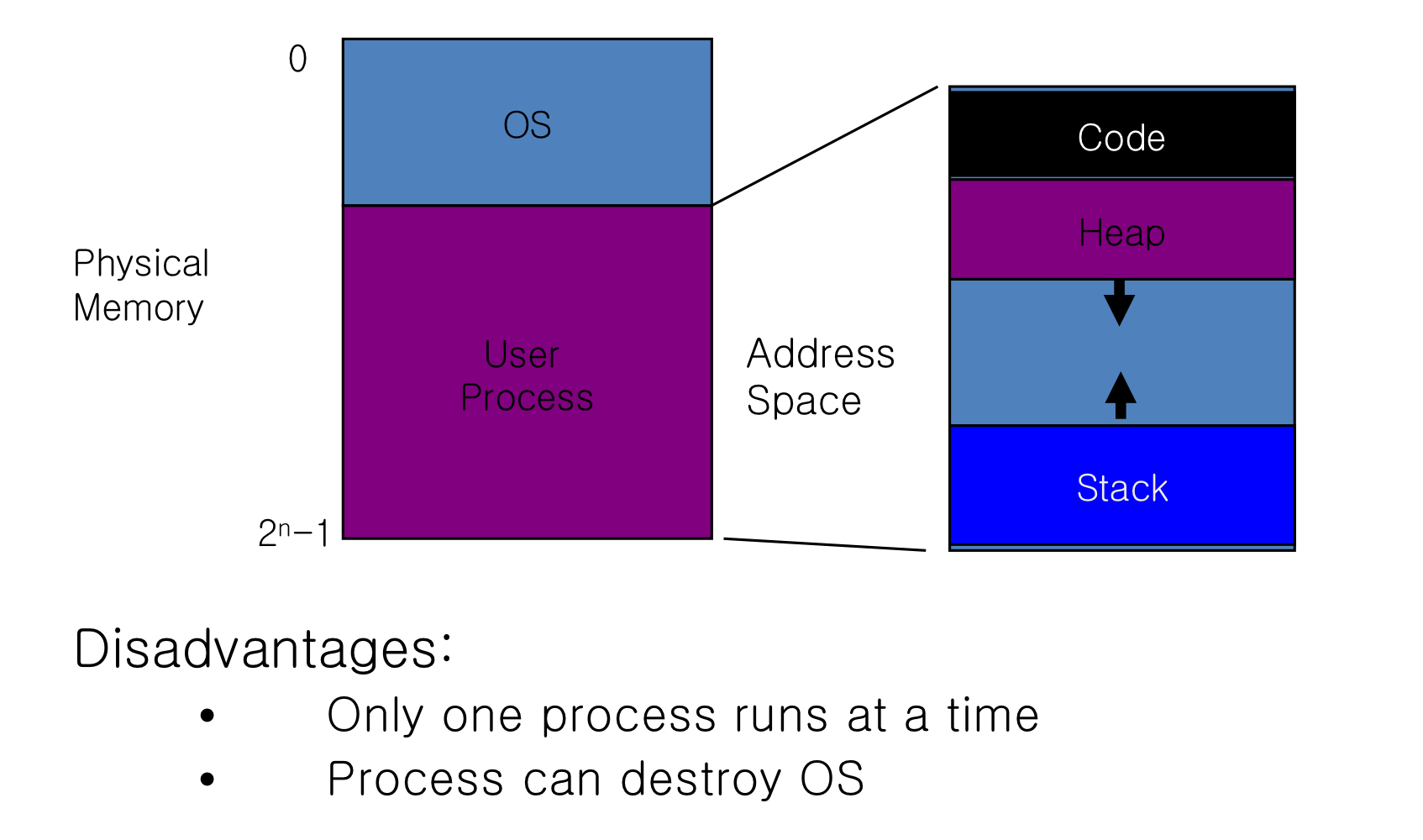 Uniprogramming : 한 프로세스만 그 시간에 돈다.