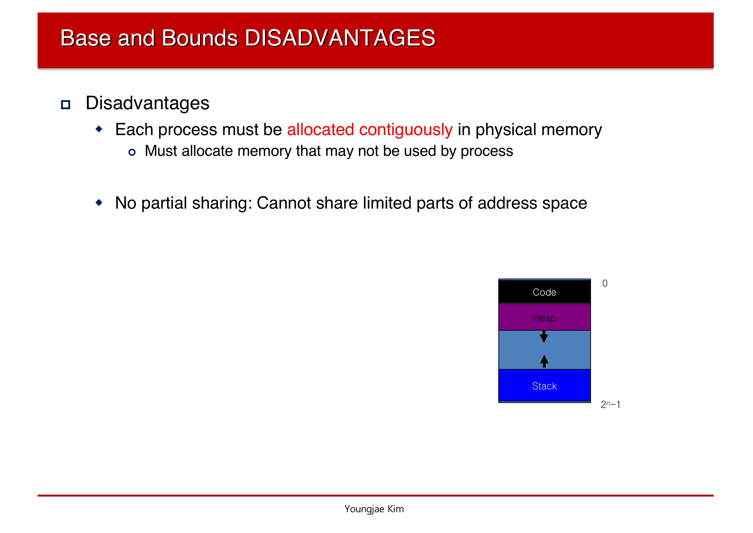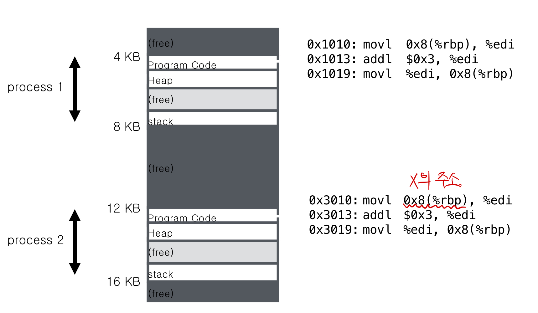 Dynamic Relocation의 문제점은 마지막 명령어 처럼 P1이 P2의 physical address를 침입할 수 있다는 것이다.