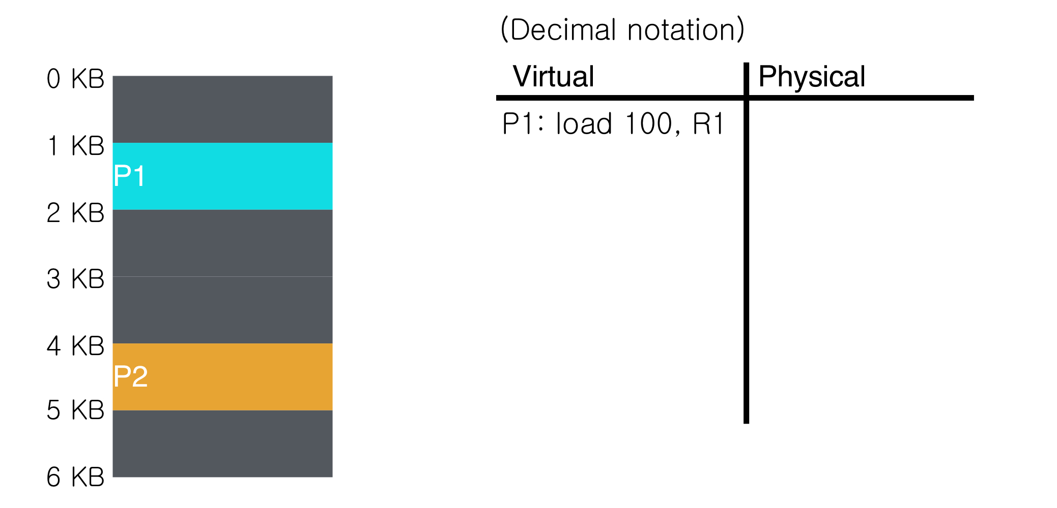 같은 코드를 가진 P1, P2가 physical address에 공간을 할당 받았다고 하자. P1의 base register는 1KB이고 P2의 base register는 4KB이다. 따라서 P1에서 load 100, R1이 발생하면 Physical 영역에서 1124(1024+100)번지를 참조하게 되고, P2에서 똑같이 load 100, R1이 발생하면 Physical 영역에서 4096+100번지를 참조하게 된다.