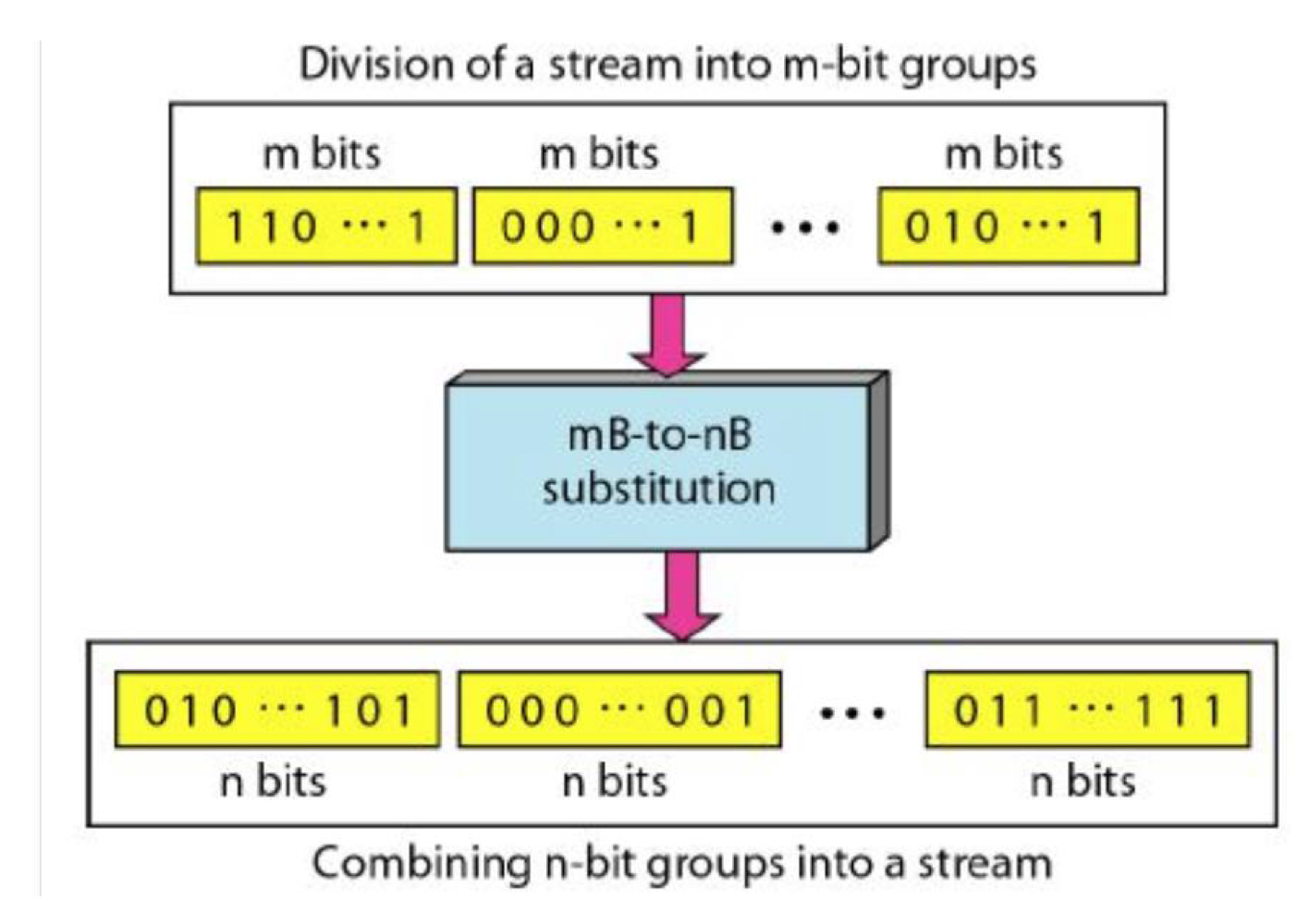 Block Coding에서 우리는 메시지들을 각각 k개의 bits들로 이루어진 blocks로 나누고 datawords라고 부른다. 우리는 r개의 redundant bits를 각각의 block에 더하고 길이가 n=k+r인 block을 만든다.