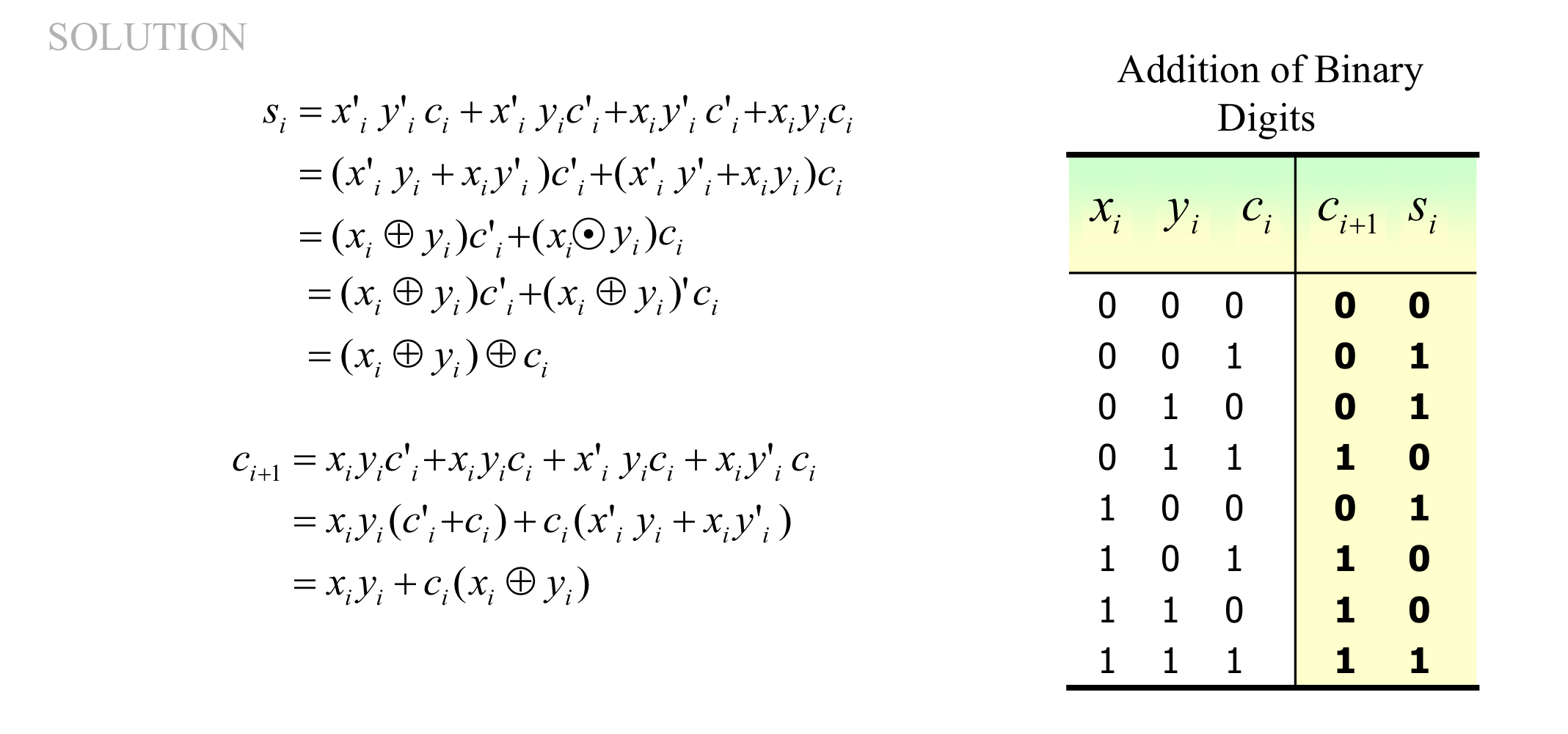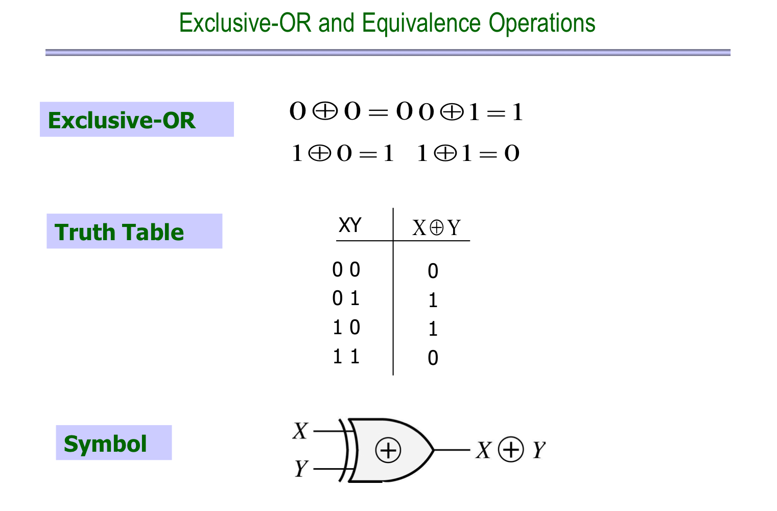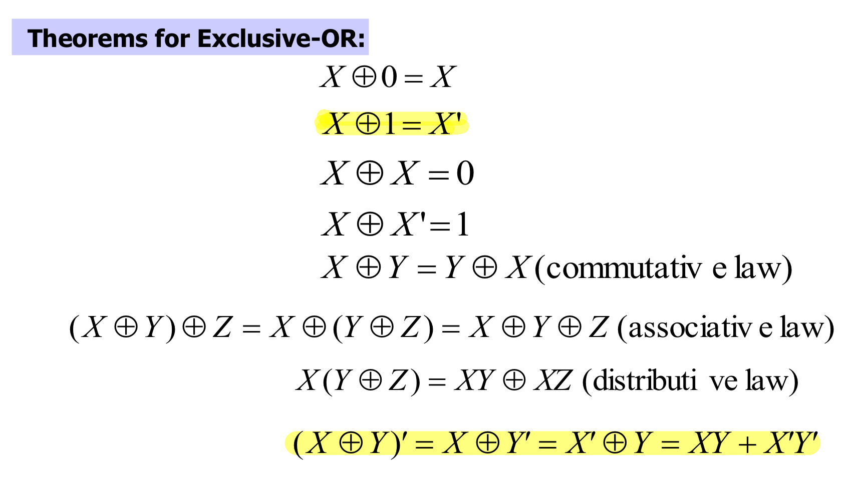 Exclusive-OR 연산의 특징이다. X⨁1=X'이 되는 것과 (X⨁Y)'=X⨁Y'=X'⨁Y=XY+X'Y' 인 것을 기억하면 될 것 같다.