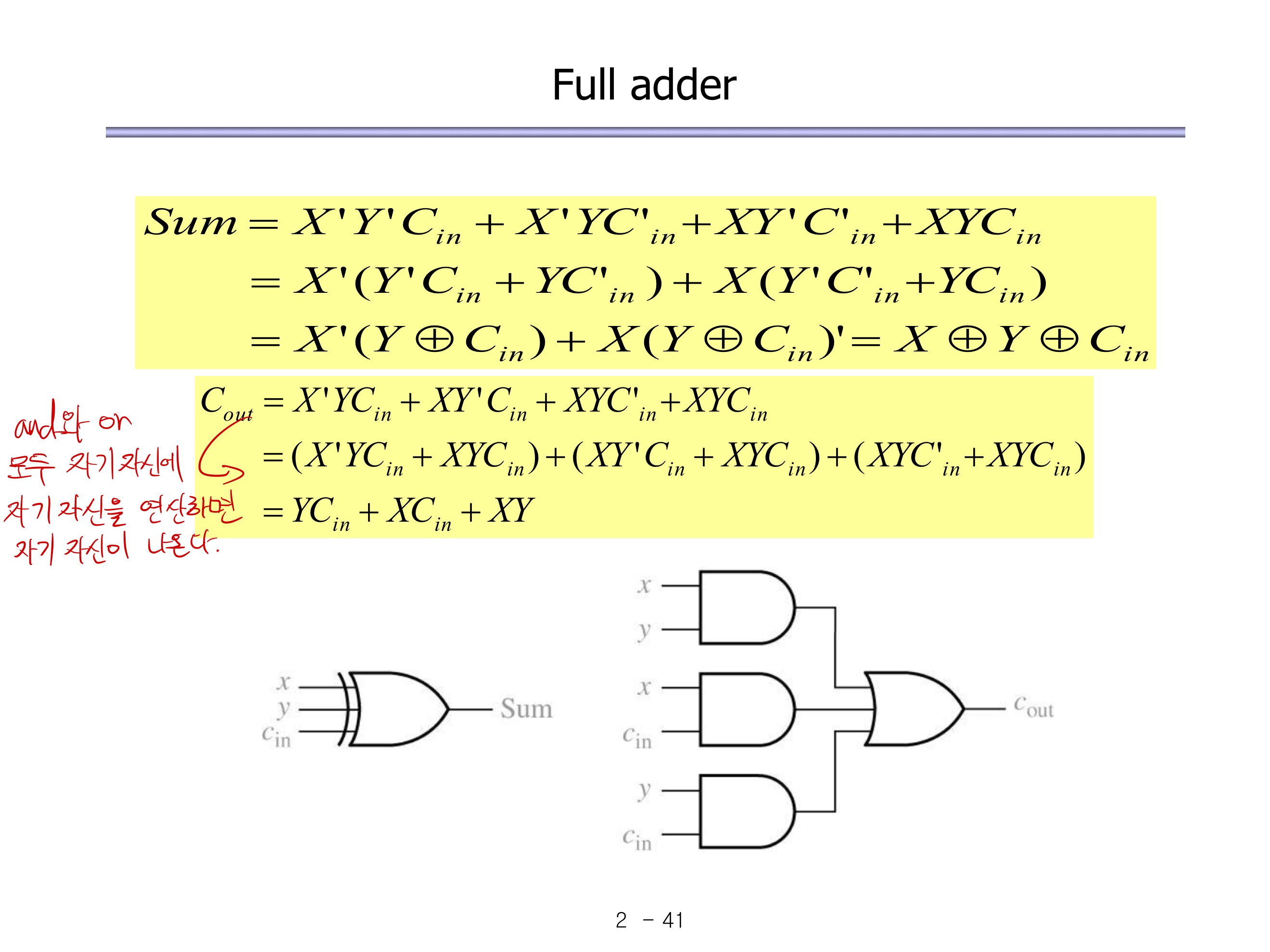 Sum = X⨁Y⨁Cin 으로 표현되고 Cout = YCin+XCin+XY로 표현된다.(Cout은 다른 표현 방법도 있는데 회로를 단순하게 하기 위해서 저렇게 표현한 것 같다.)