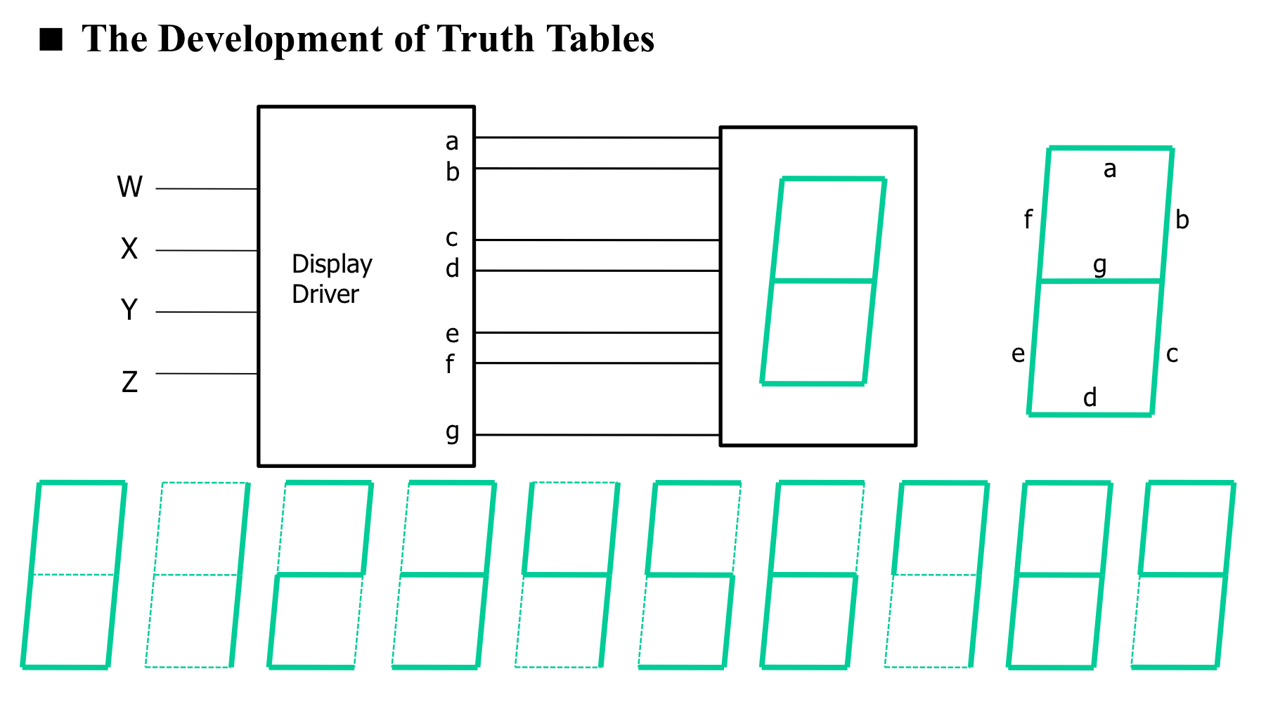 디지털시계 등 에서 숫자를 표현하는데 사용되는 A seven-segment display이다. 0~9 까지만 표현하면 되므로 4bit(X,Y,Z,W)만 있으면 된다.