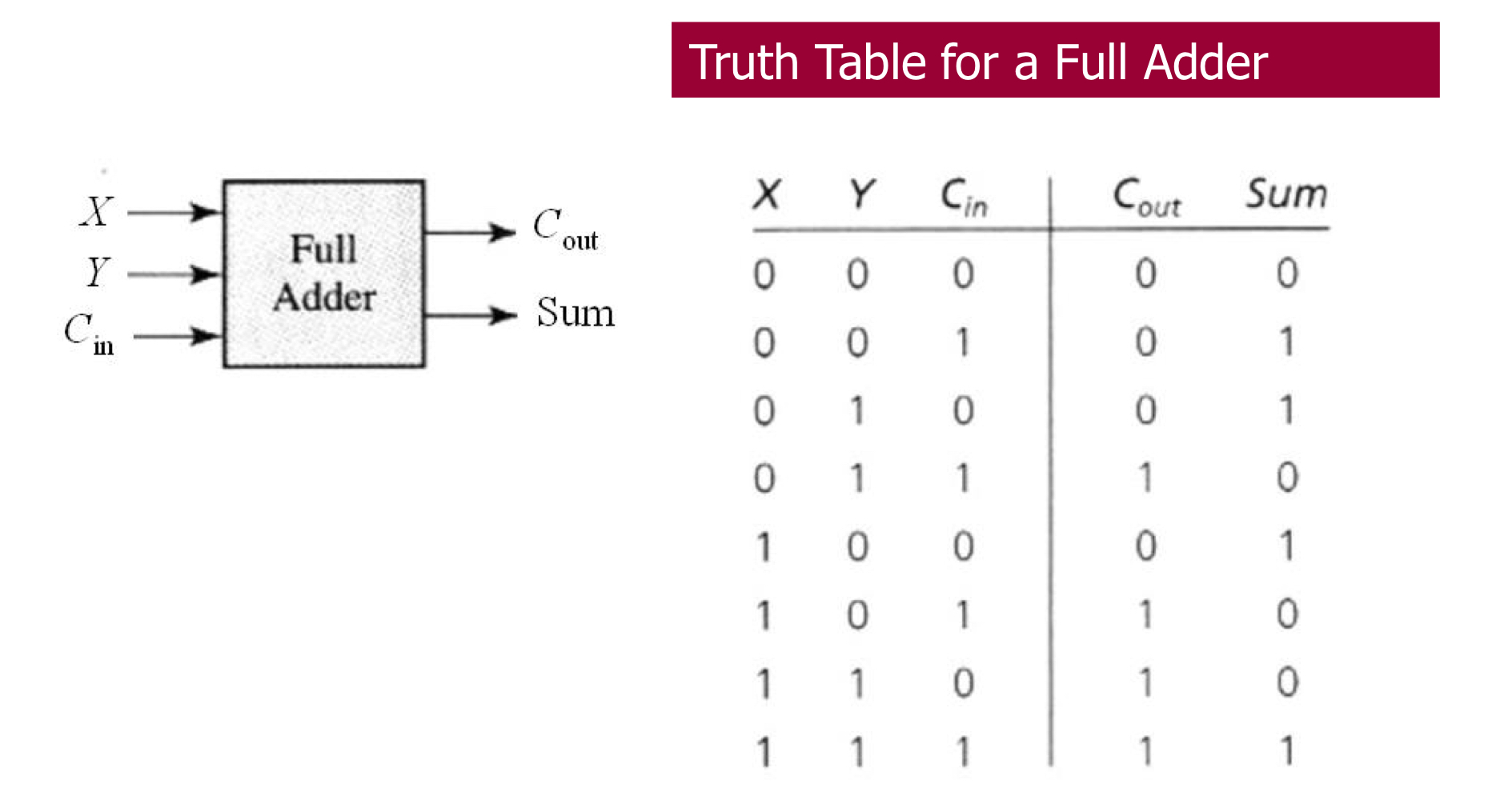 두 개의 Binary 수를 더할 때, 같은 자리에 위치한 X,Y가 더해진다고 하자. 더해질 수 있는 요소는 X,Y 그리고 한 자릿수 밑에서 발생 할 수 있는 Cin까지 총 3가지이고 발생하는 결과는 Sum과 2를 초과할 경우 발생하는 Cout이 있다.