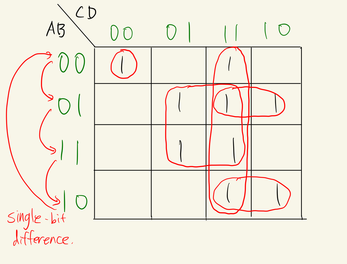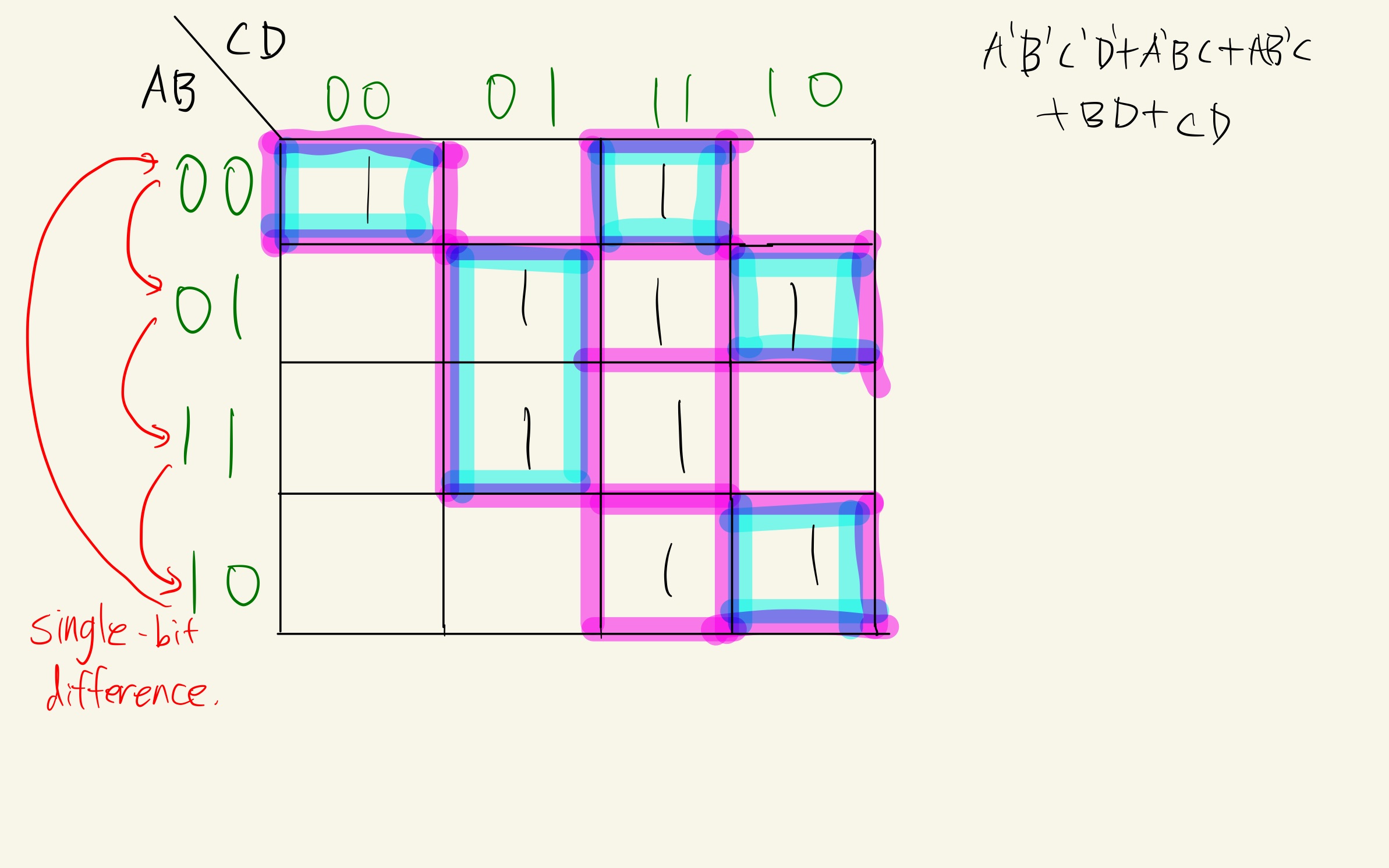 주어진 F를 이용하여 Karnaugh Map을 만들면 위와 같고 implicant를 빨간색으로 묶어봤다. 여기서 00,01,11,10 순인 이유는 인접한 bit끼리 single-bit difference를 유지하기 위해서이고, single-bit difference를 유지해야 implicant를 묶는데 문제가 없다.