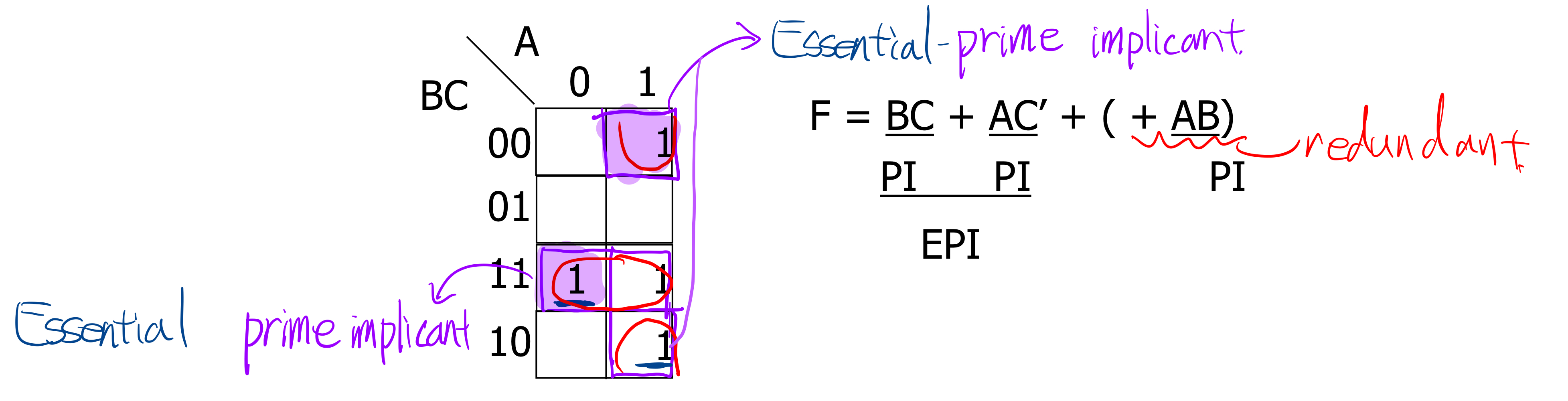 해당 Karnaugh Map에서 BC+AC'은 보라색 형광펜으로 친 부분 때문에 Essential prime implicant가 된다. AB는 prime implicant도 안되고 redundant가 되버린다.