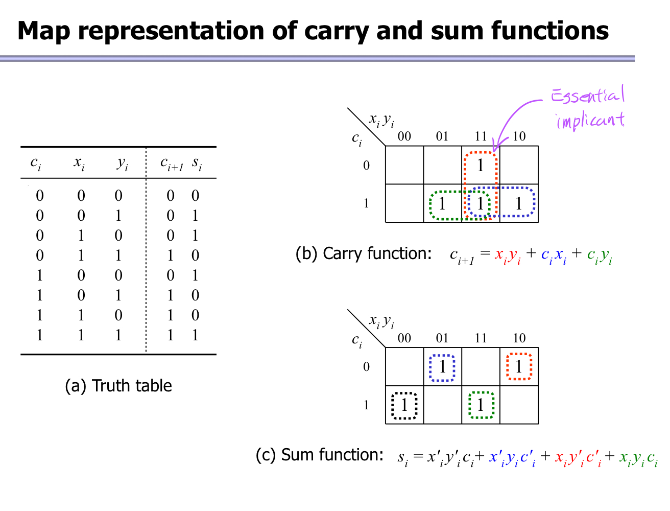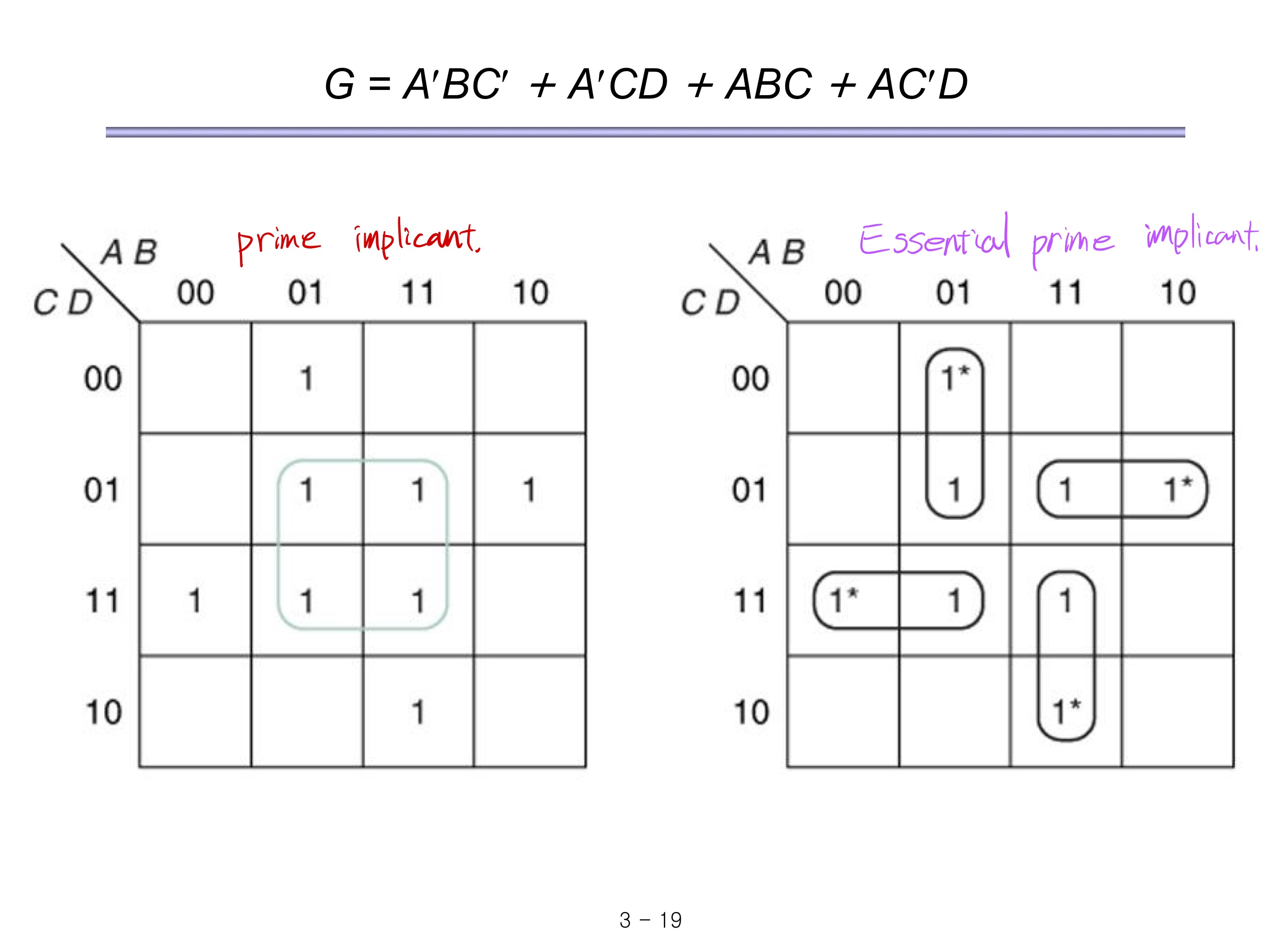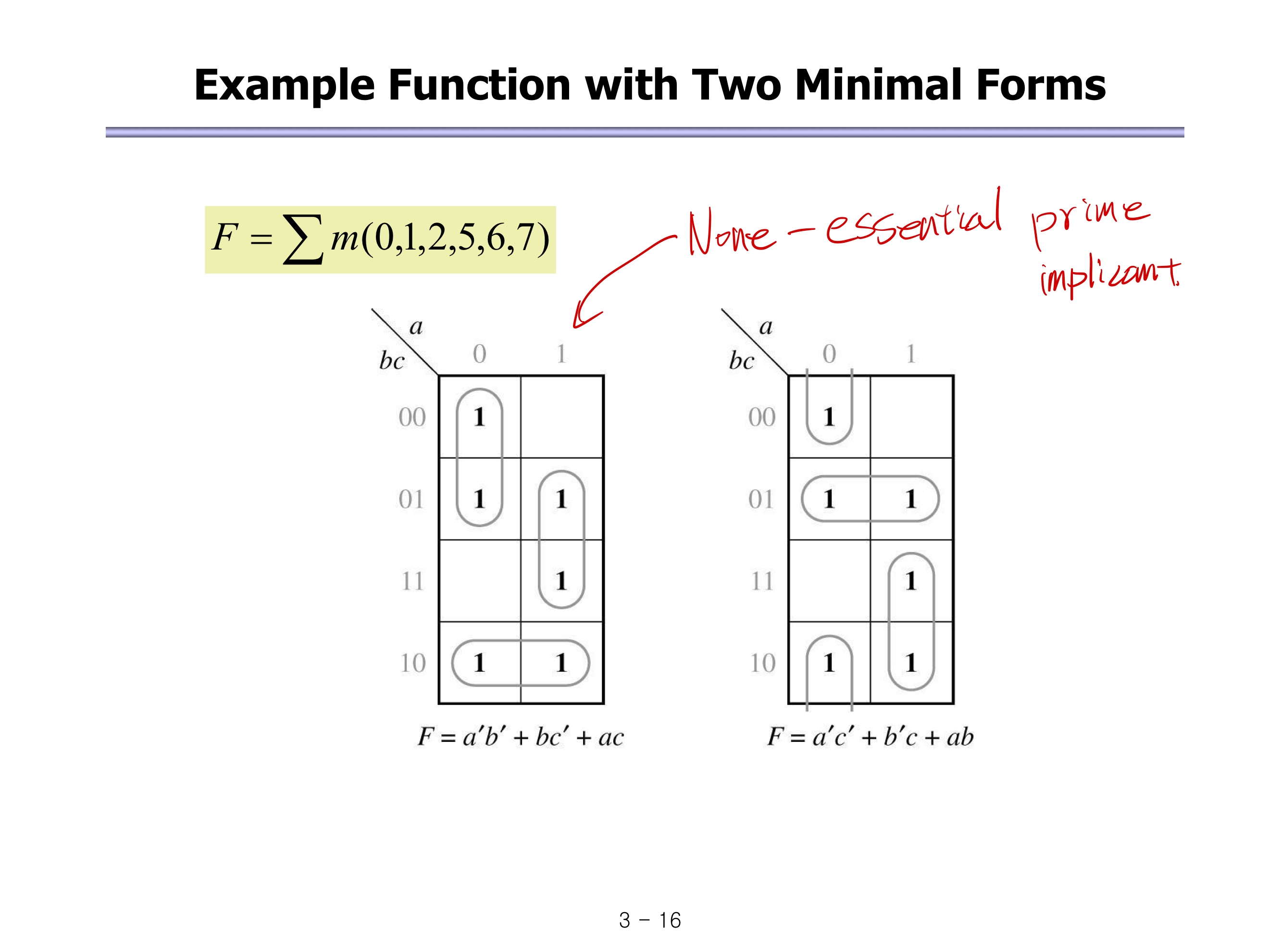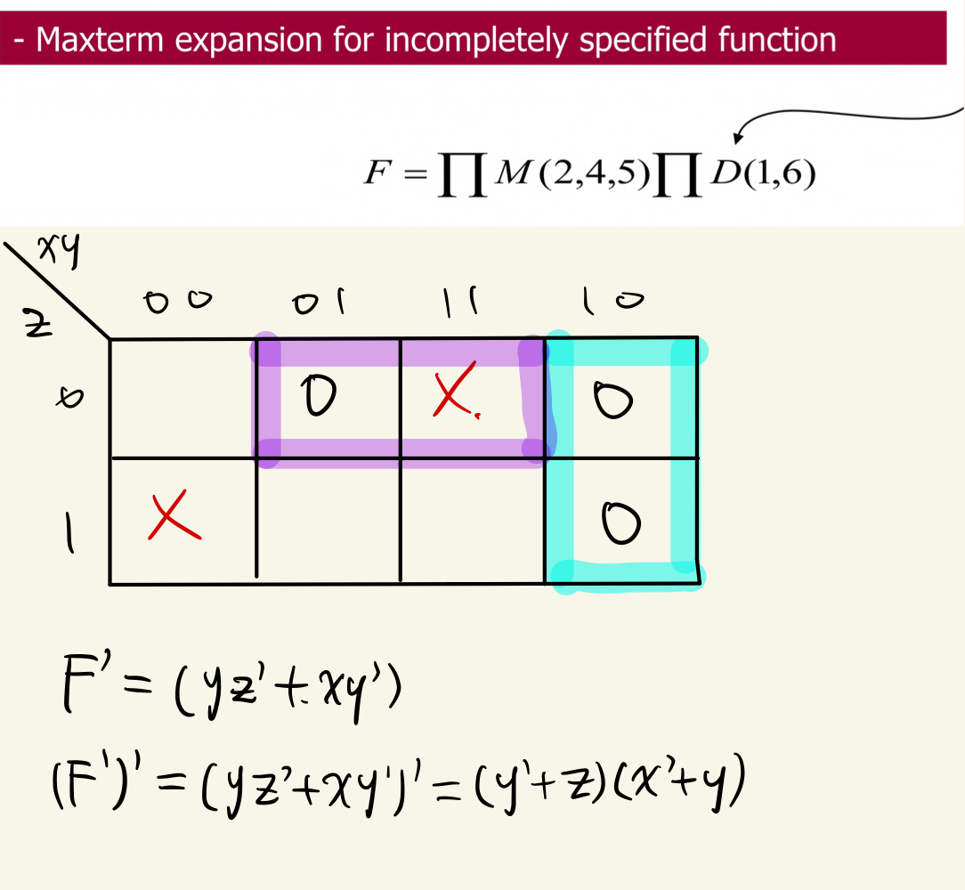 따라서 위 처럼 x'y+xy'+xz 또는 x'y+xy'+yz 로 나타낼 수 있다. 참고로 모든 implicant가 Essential prime implicant이다.