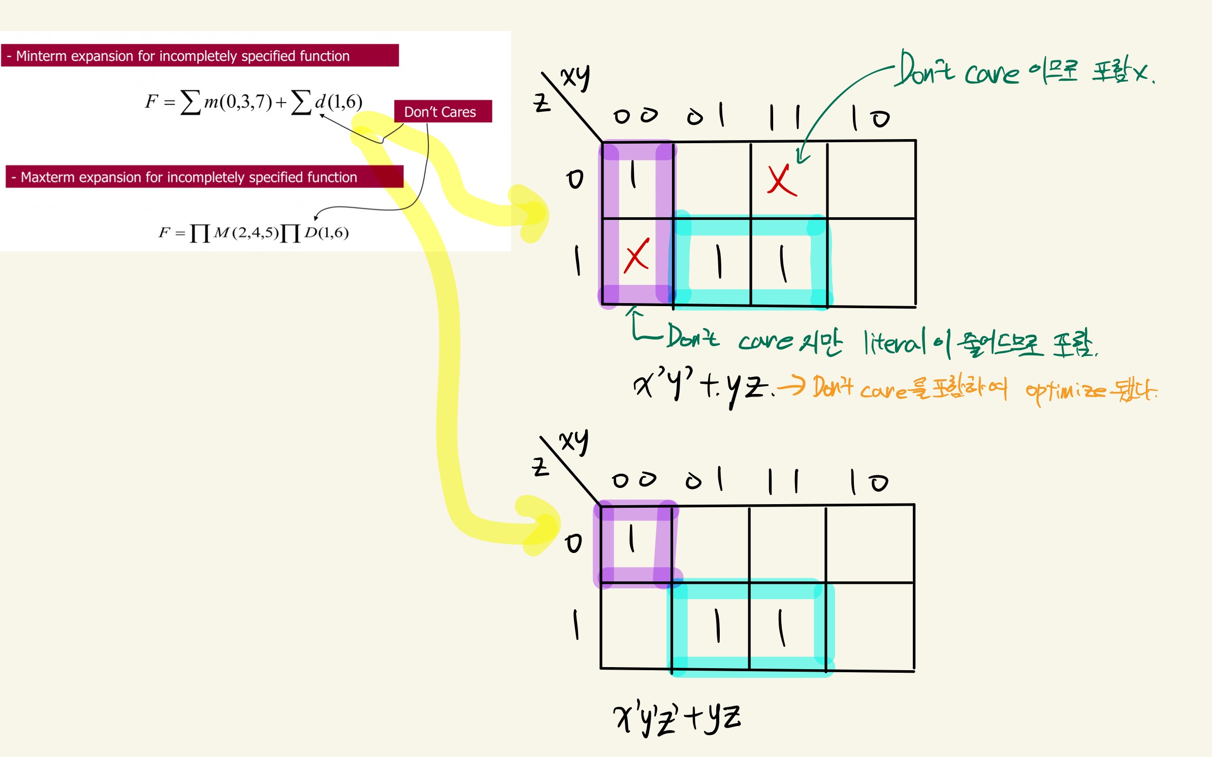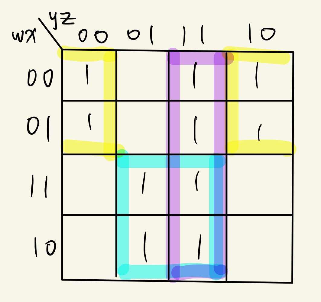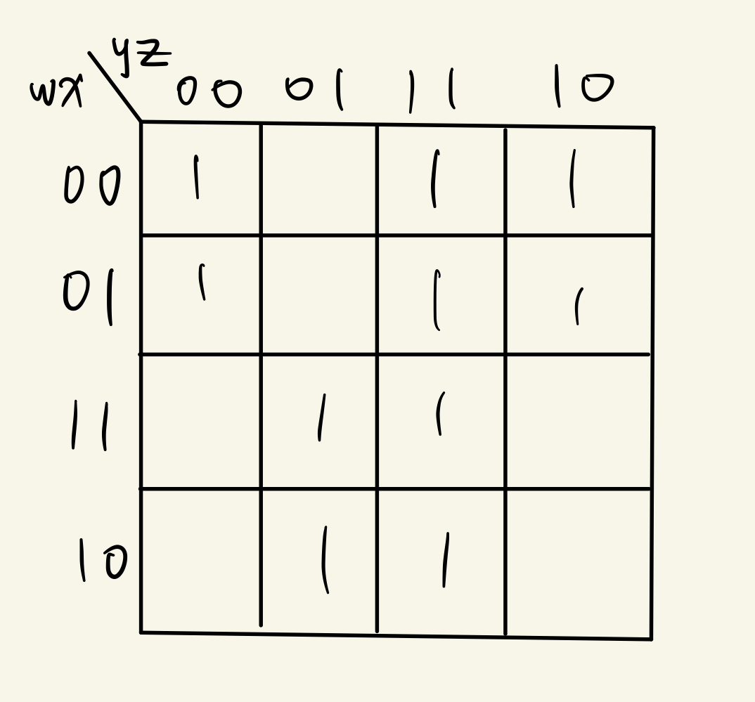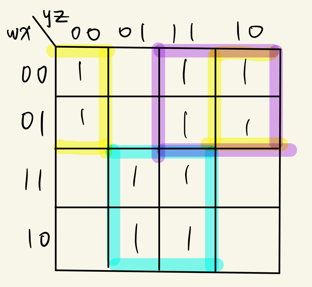 Karnaugh Map을 이용하여 example을 minimize하면 w'z+yz+wz(왼), w'z+wz+w'y(오)가 나오게 된다.