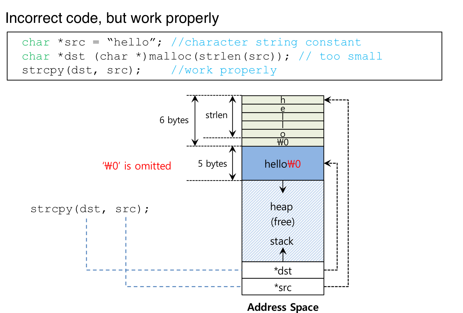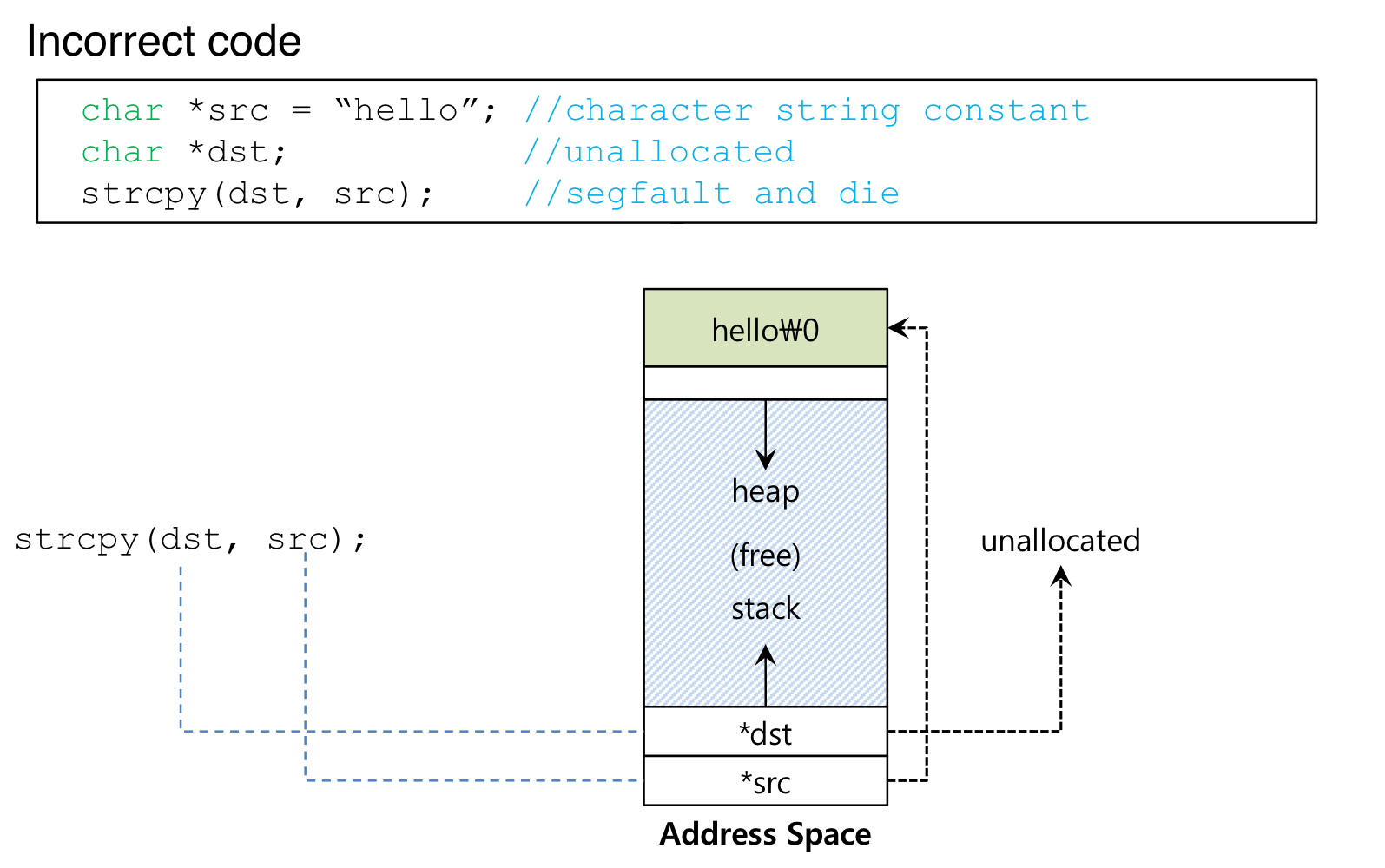 언뜻 보면 위에 코드가 맞는 것 처럼 보이지만 *dst는 unallocated되어있기 때문에 *src의 내용을 받을 공간이 없다.
