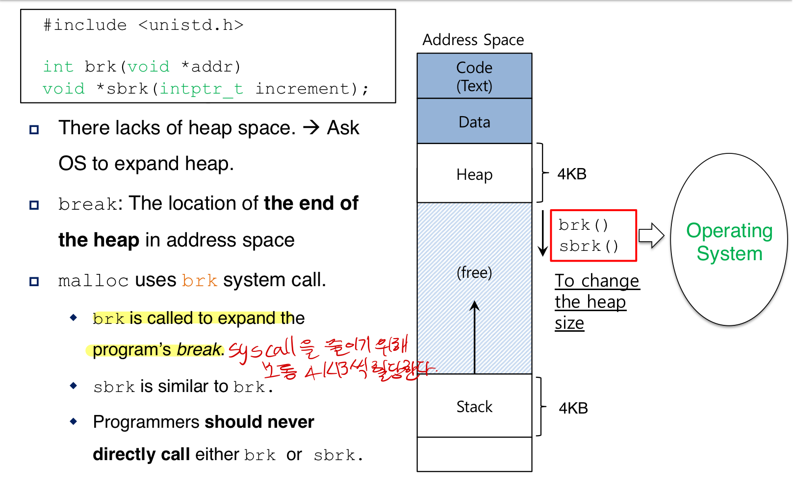 API를 통해 System call이 발생하면 brk나 sbrk를 통하여 공간을 할당해준다.(줄여줄 수 도 있다.) 한 번 할당할 때 System Call을 줄이기 위하여 보통 4KB씩 공간을 할당해 준다.