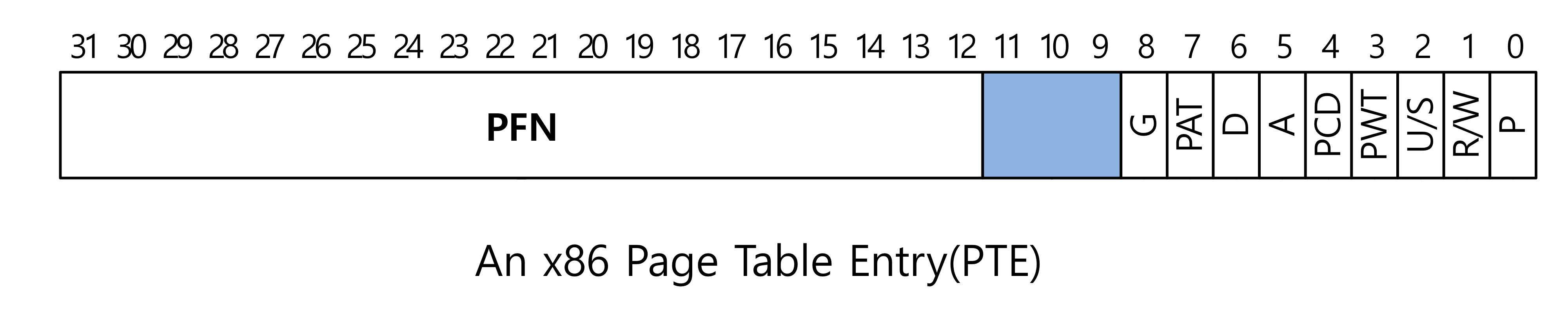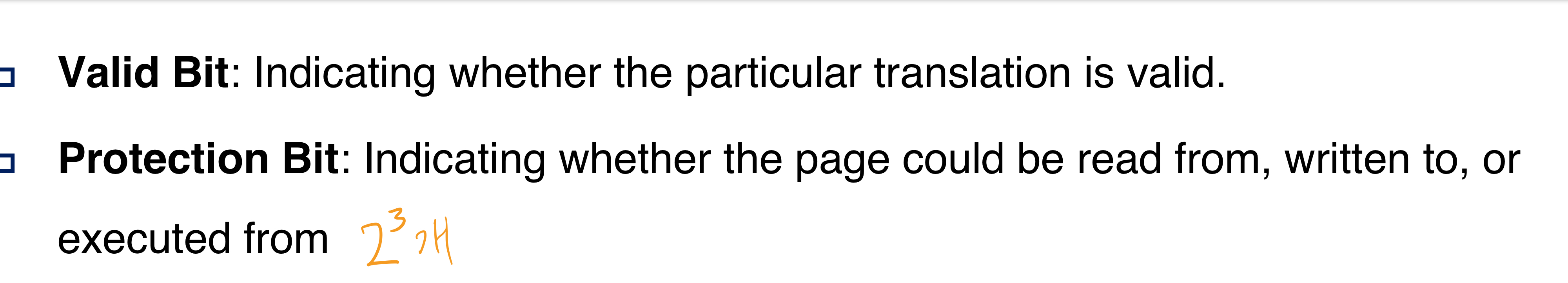 Valid bit는 1개이고 protection bit는 read,written,executed를 표현하기 위해 3개의 bit가 필요하다.