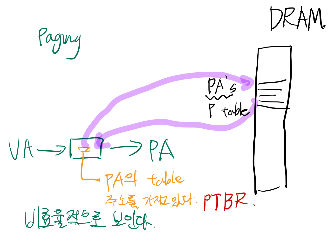 segmentation과 paging을 비교하였을 때, segmentation은 하드웨어에서 바로 logical address를 physical address로 바꿔주지만, Page table은 너무커서 DRAM에 저장되어 있기 때문에 paging은 logical address를 physical address로 바꿔 줄 때마다 DRAM에 접근해야 한다.