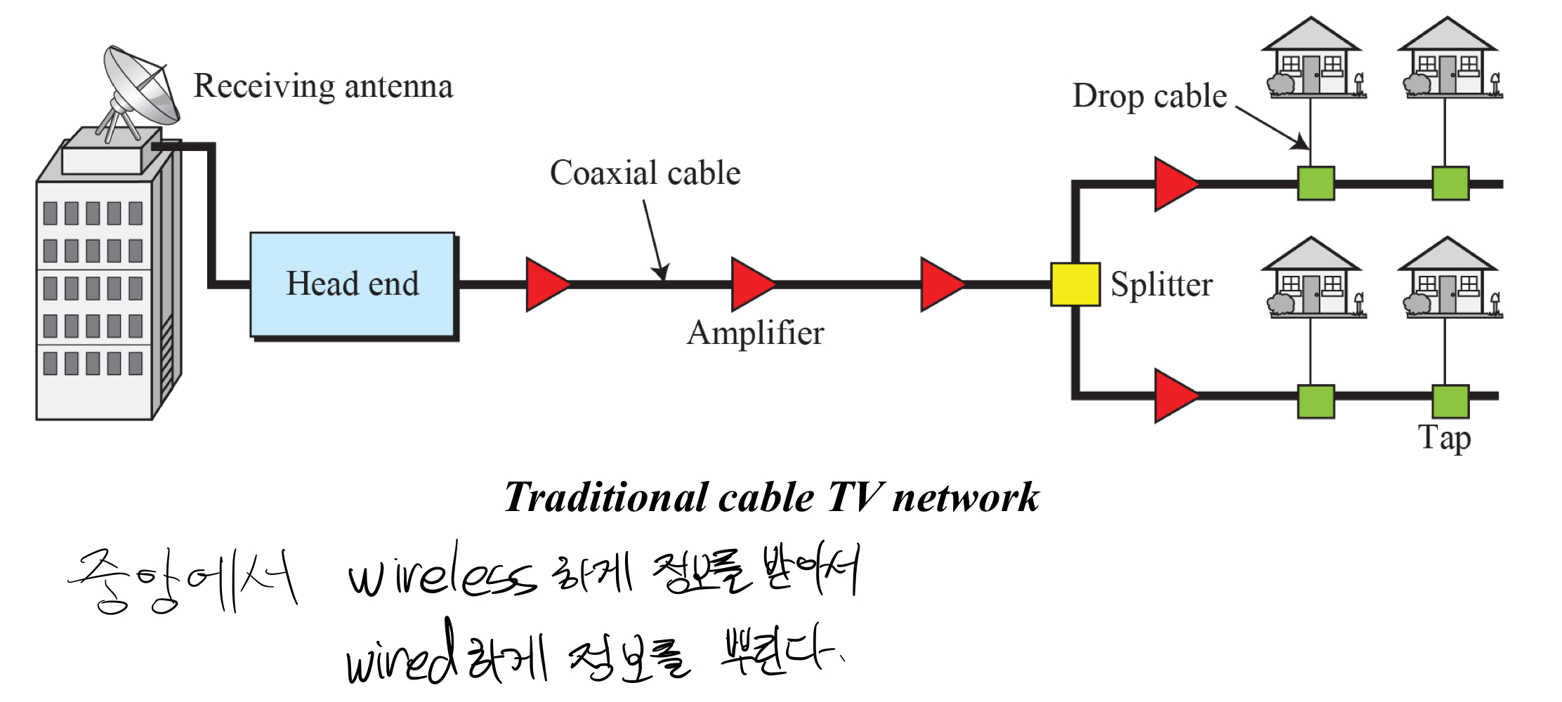 큰 언덕이나 건물 위에 안테나가 TV station으로 부터 signal을 받고 coaxial cable을 통해 사람들에게 전송하기 때문에 community antenna television(CATV)라고 불린다.