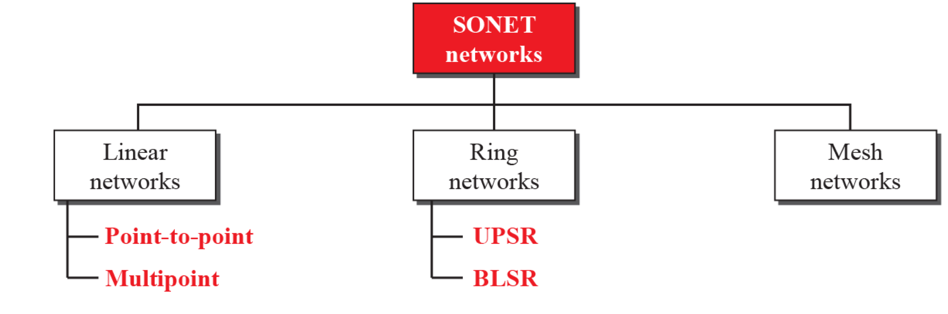 SONET은 linear, ring, mesh networks, 이렇게 3가지 카테고리로 나뉠 수 있다.
