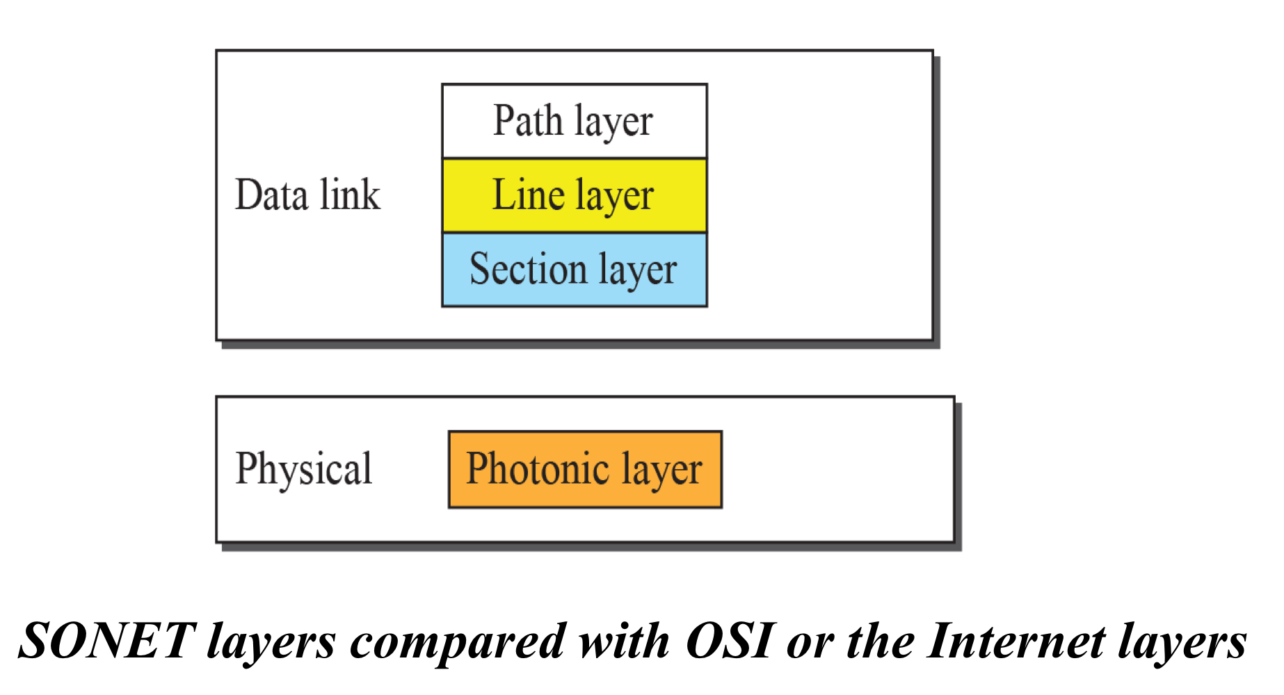 SONET standard는 photonic,section,lie,그리고 path layer, 이렇게 4가지 functional layers를 포함한다.