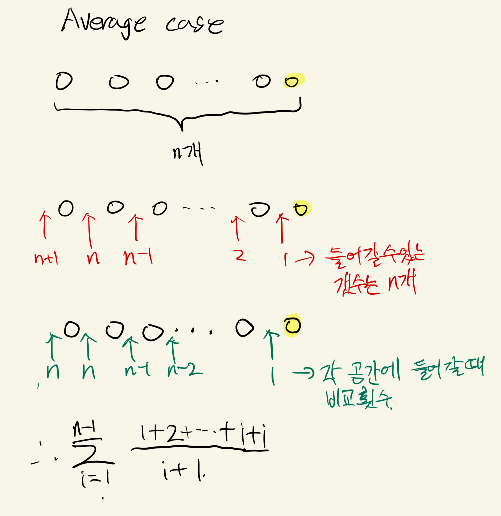 Selection sort는 중간에 멈추는 조건이 없기 때문에 worst case와 average case의 시간 복잡도가 같다.