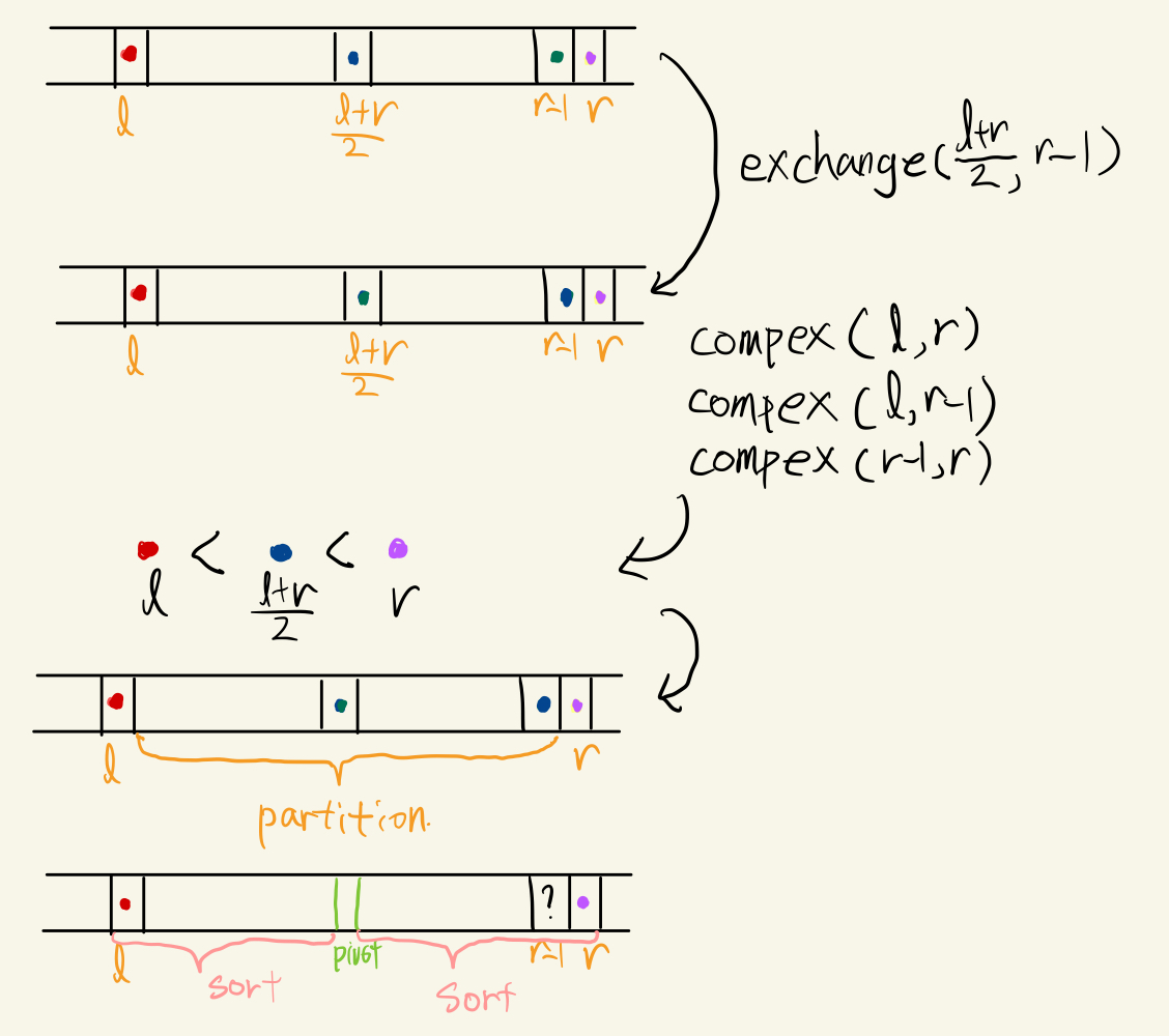 그렇게 되면 l<(l+r)/2<r이 되게 되는데 이렇게 되면 훨씬 더 좋은 pivot을 얻을 수 있고 tree의 depth를 줄여서 재귀가 돌아가는 것을 방지 할 수 있다.
