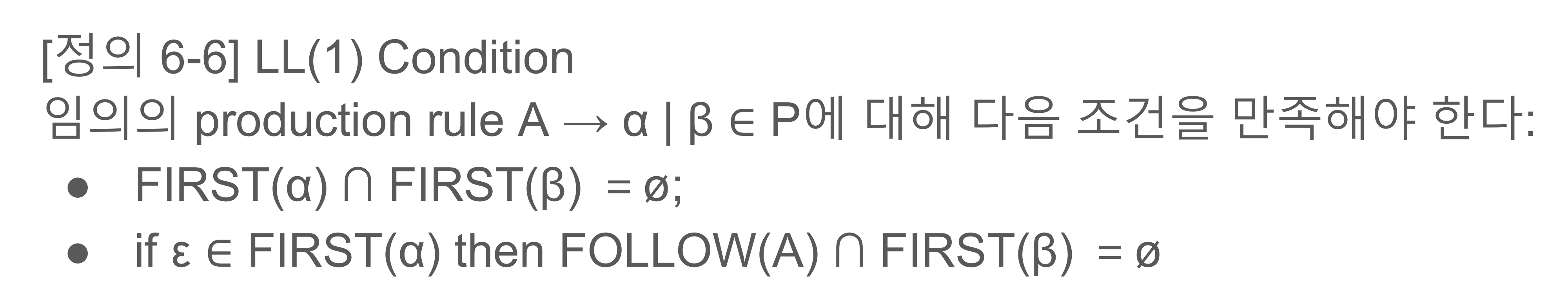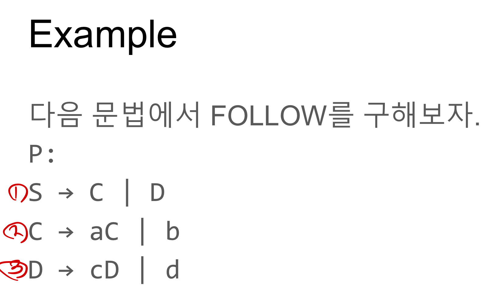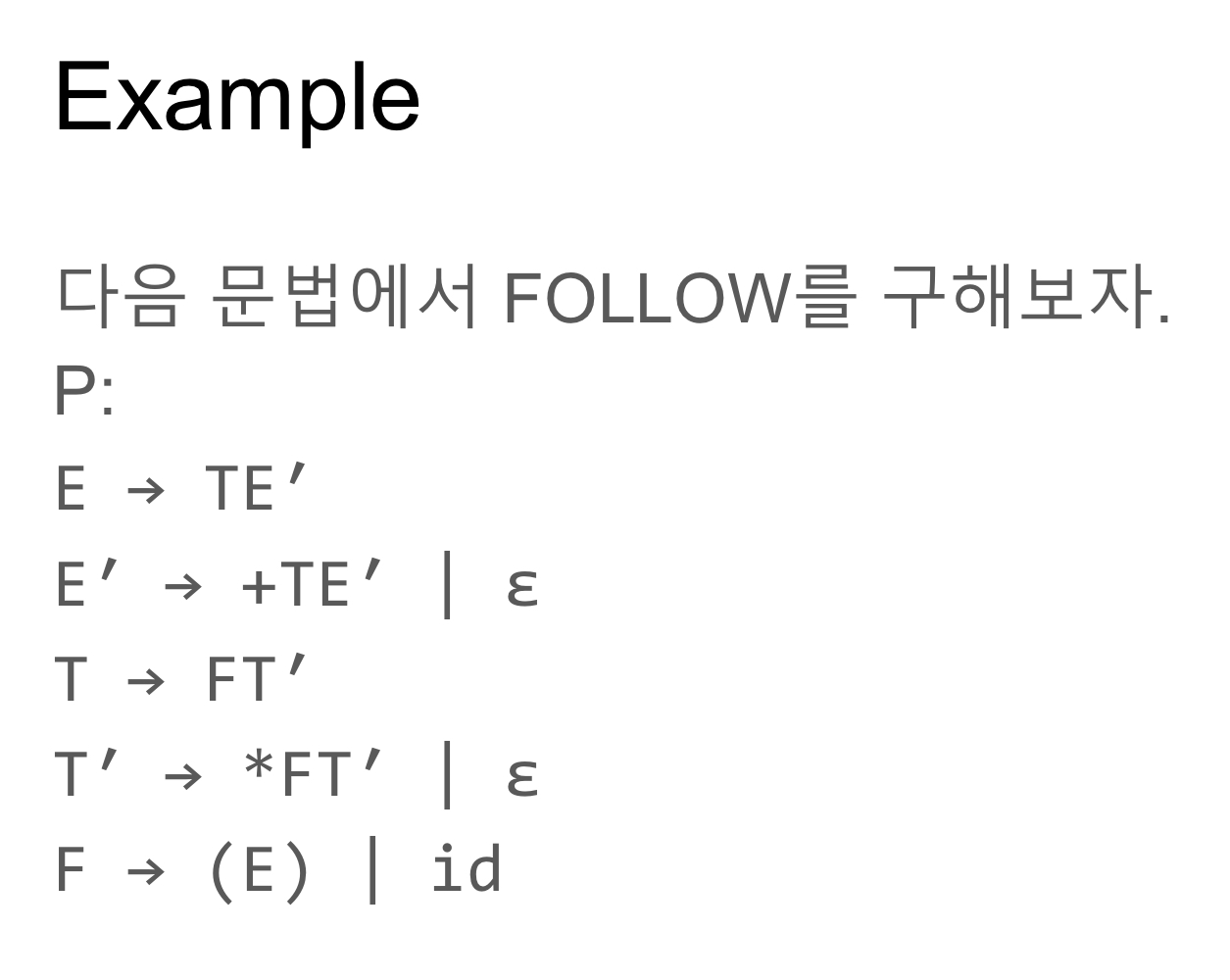 FOLLOW(A)는 어떤 문장 형태에서 논터미널 기호 A다음에 나오는 터미널 기호들의 집합이다.