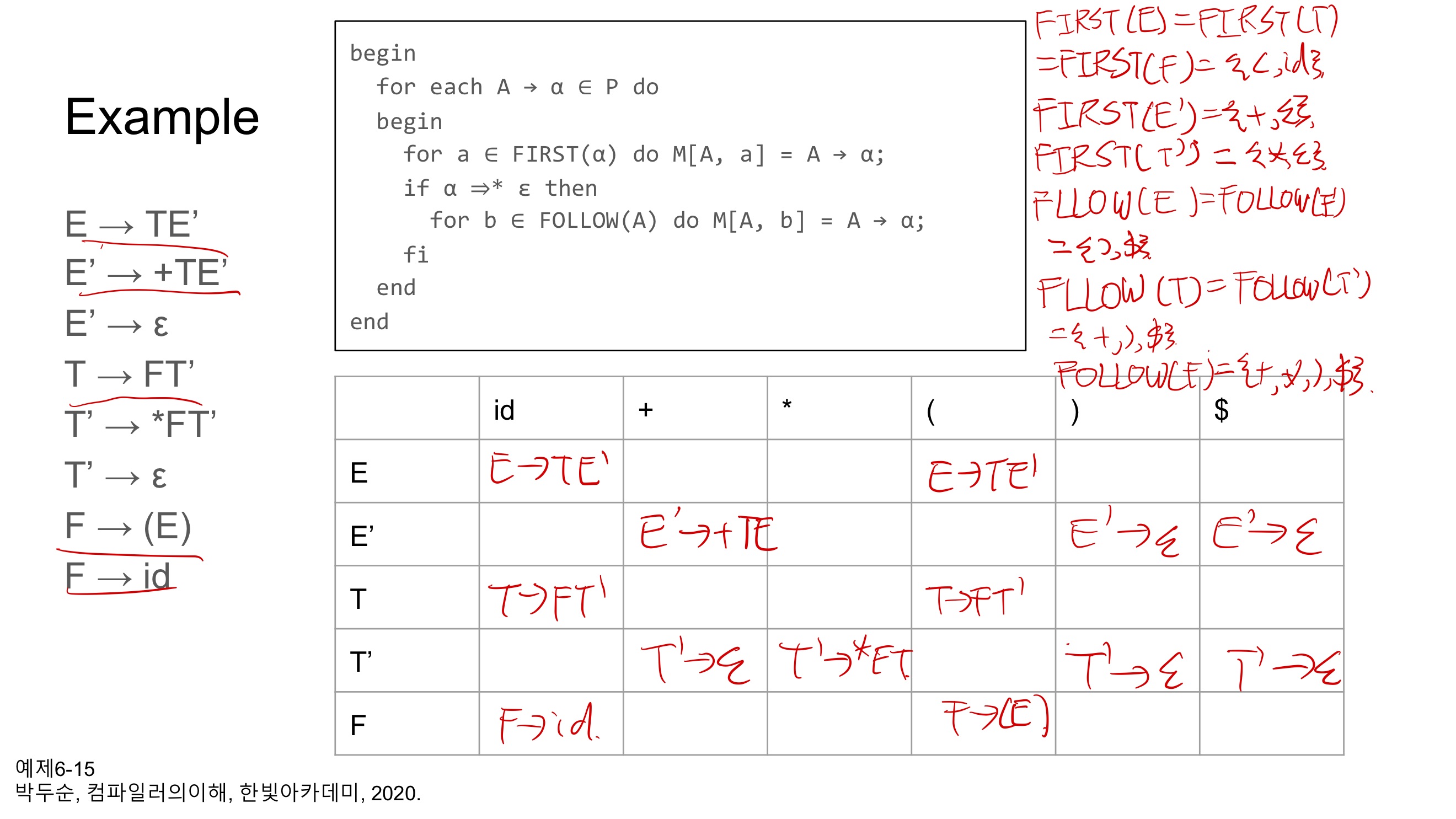- Terminal symbol에 대한 프로시저는 production rule에 있는 terminal symbol과 input symbol이 같은지 비교하여 같은 경우 다음 input symbol을 읽게 한다.
