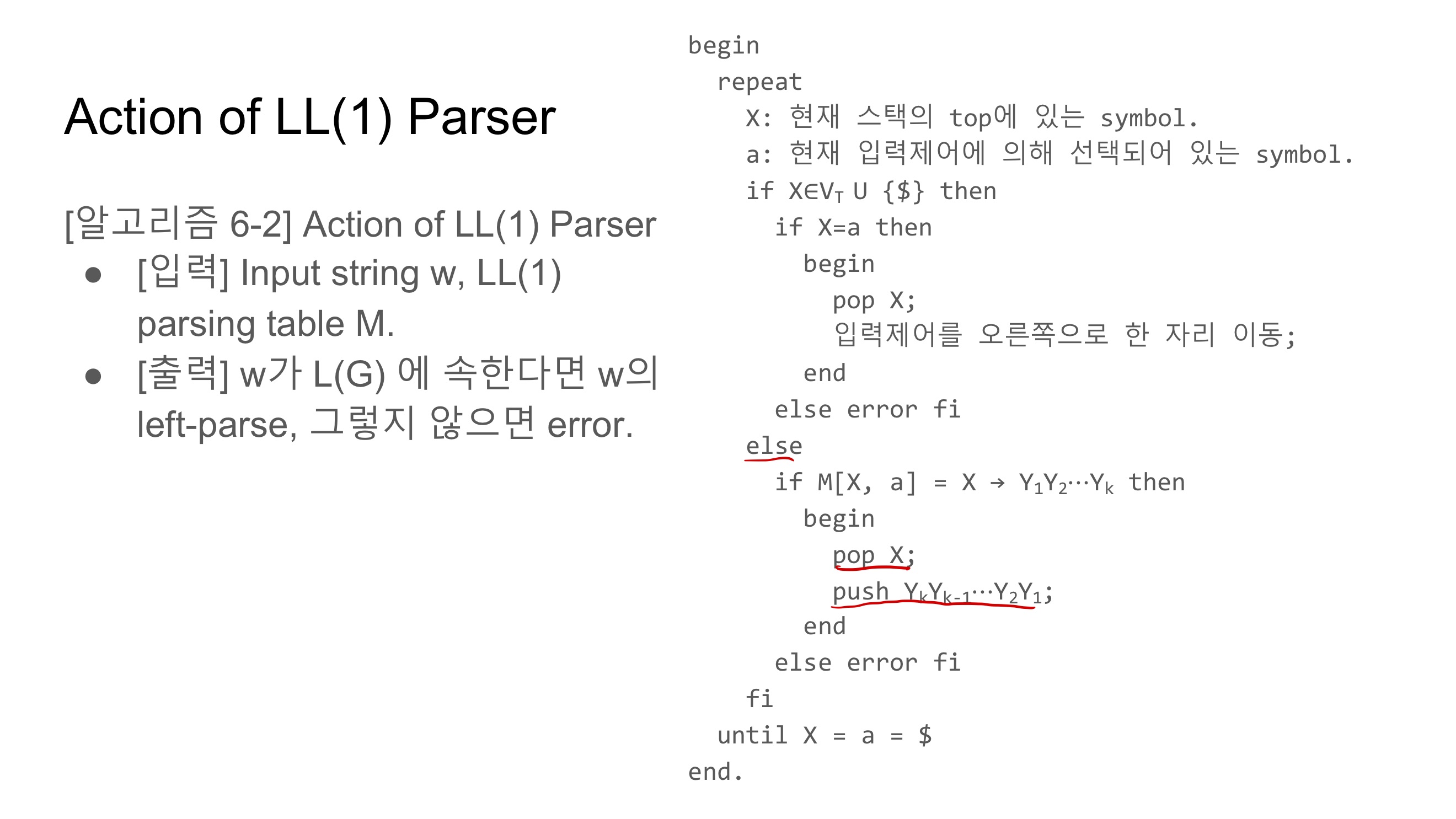 - Nonterminal symbol에 대한 프로시저는 현재의 input symbol를 생성할 수 있는 적절한 생성 규칙이 선택되도록 작성한다.