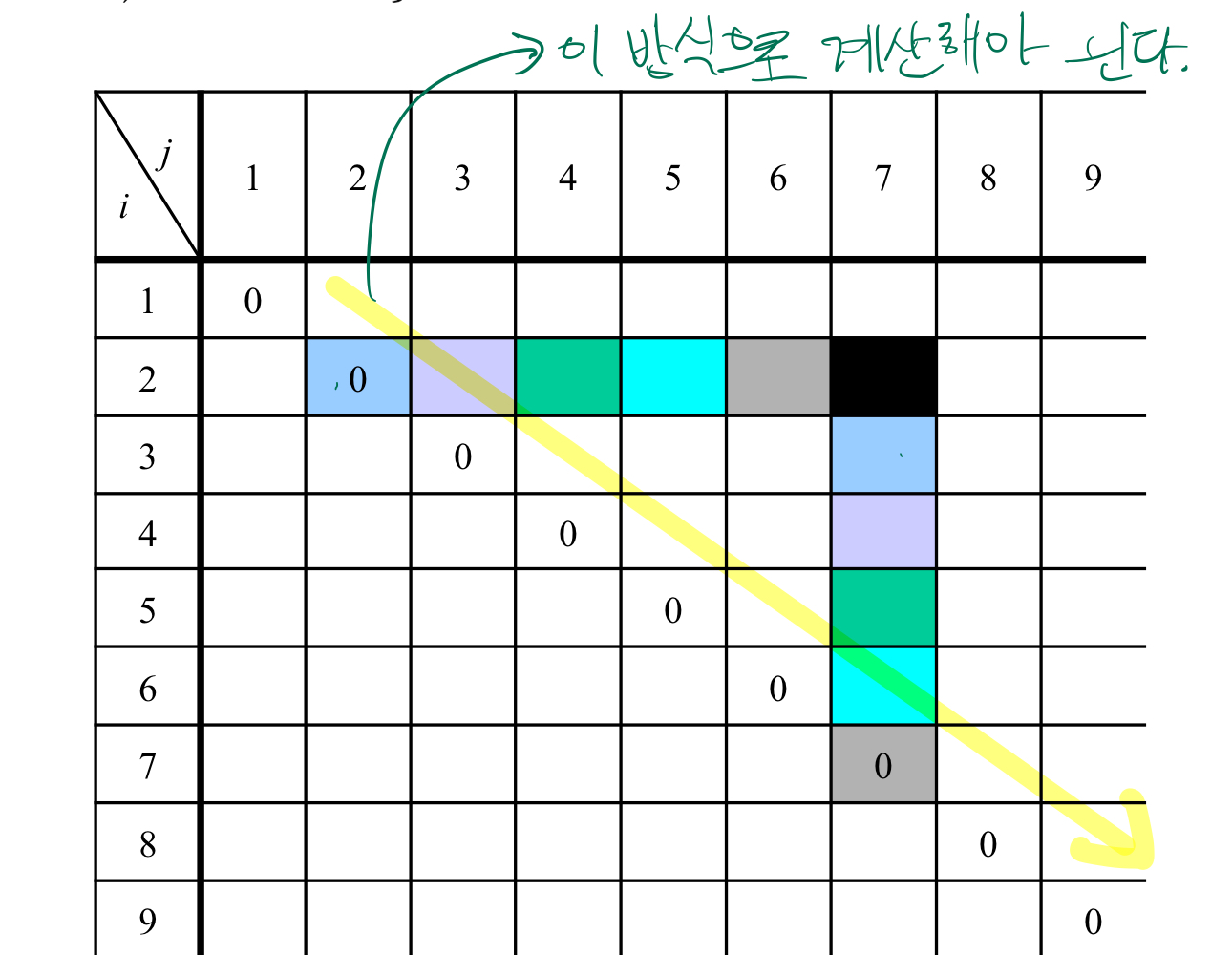 Table의 대각선에 초기값을 설정하고, A2*A7(i=2,j=7)을 구하고 싶다면 위처럼 색칠한 부분만 구하면 된다. 단, 한칸 움직일 때마다 반복문이 i에서 j-1번까지 돈다.