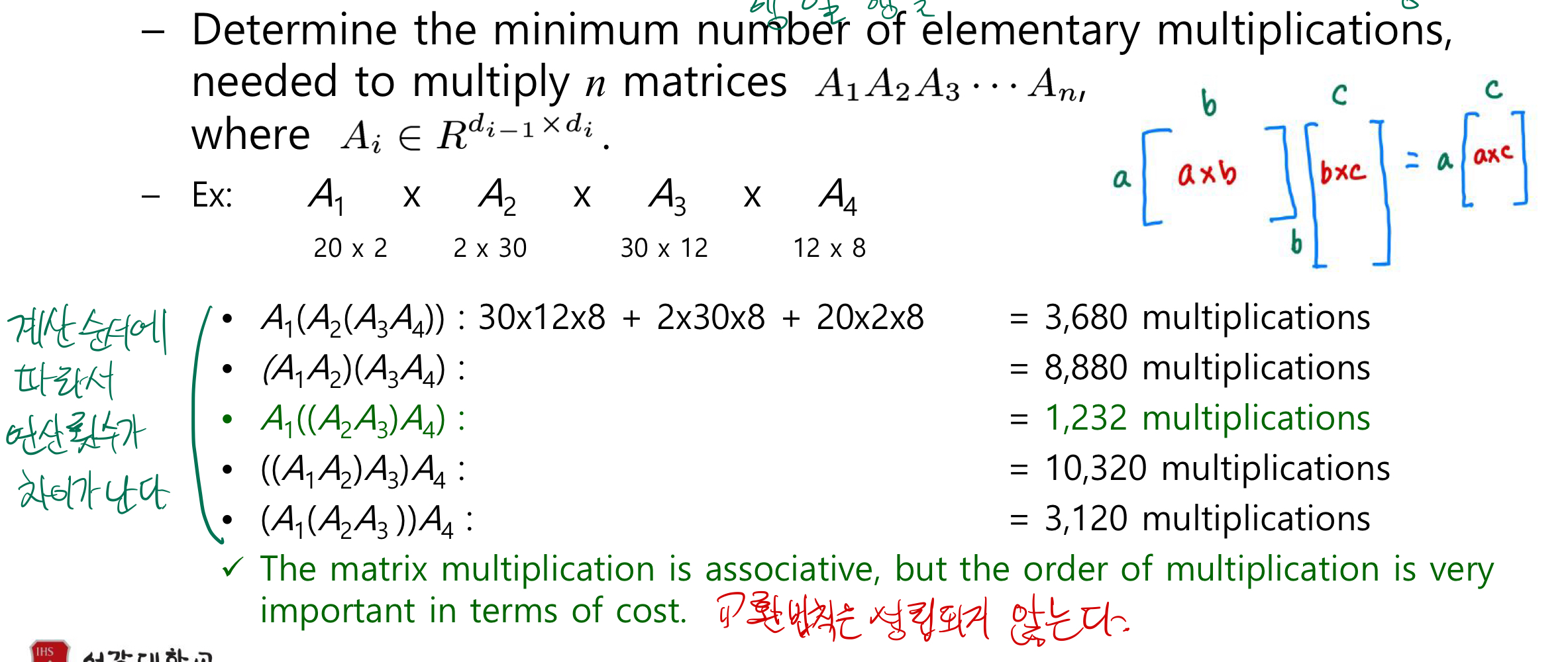 행렬의 곱셈에서 무엇을 먼저 계산하는지에 따라 연산횟수가 달라진다.