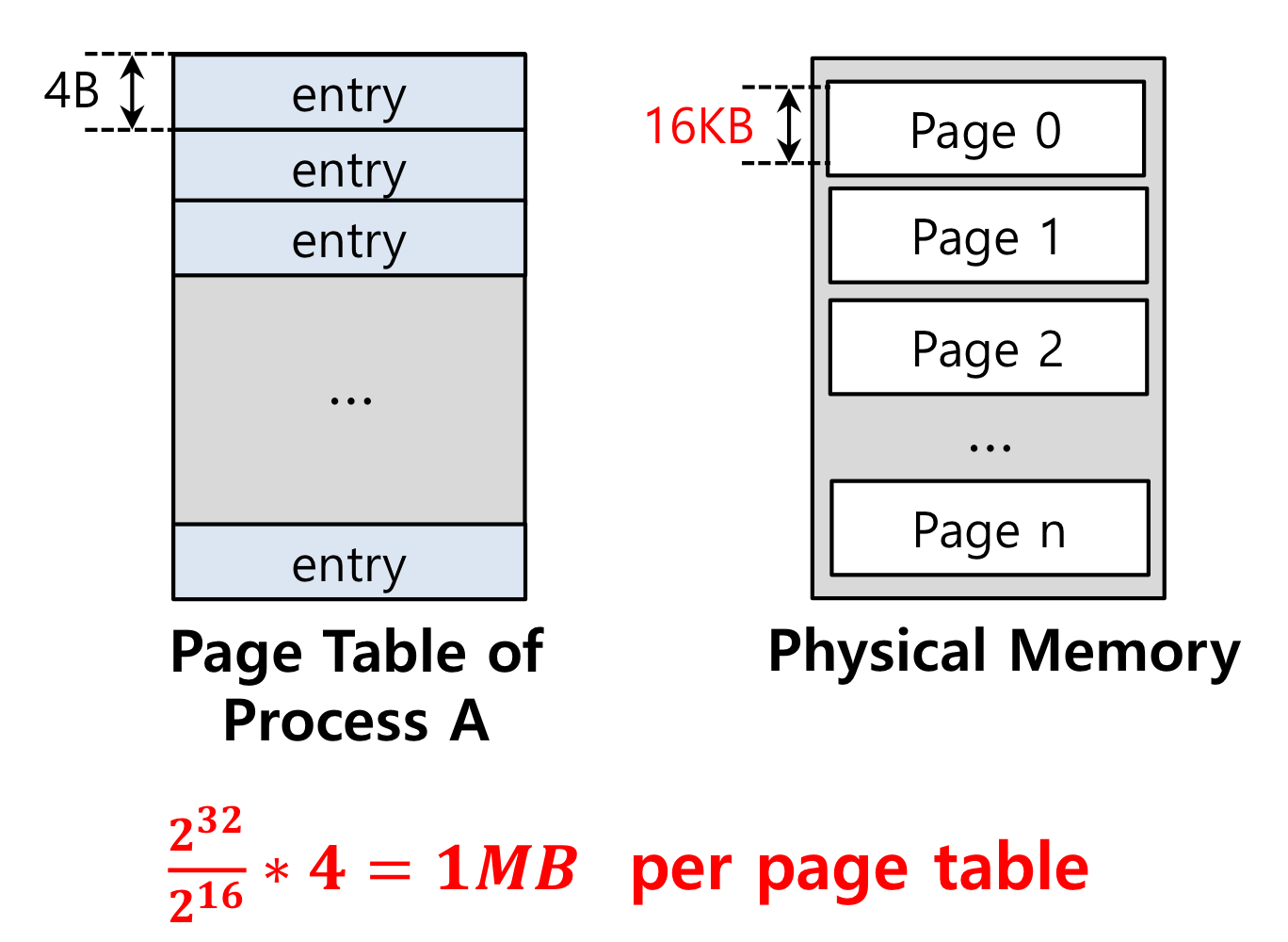 32-bit address를 space를 사용하고 4KB의 page table을 사용한다면 Page table의 크기는 2^32/2^12*32=4MByte의 크기를 차지하게 된다. 이 page table의 크기는 너무 크다.