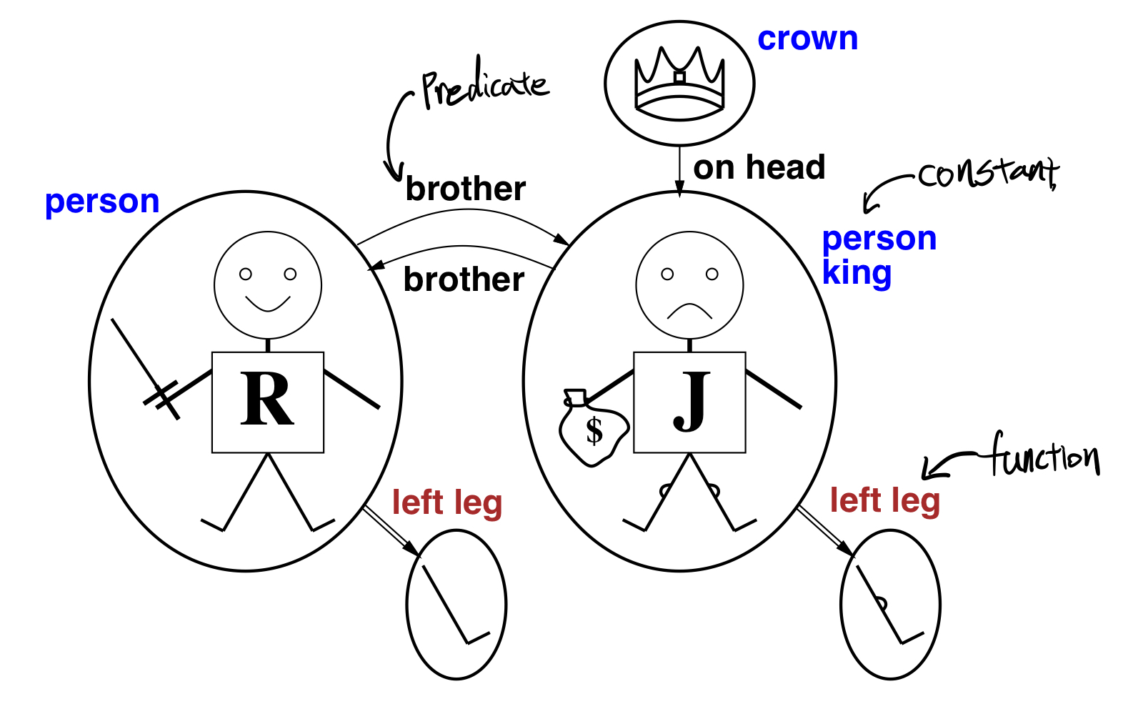 Objects(people, houses, numbers...), Relations(red, round, bogus, prime, bigger than, .. ), Functions(father of, best friend, one more than ..)를 포함한다고 가정한다.