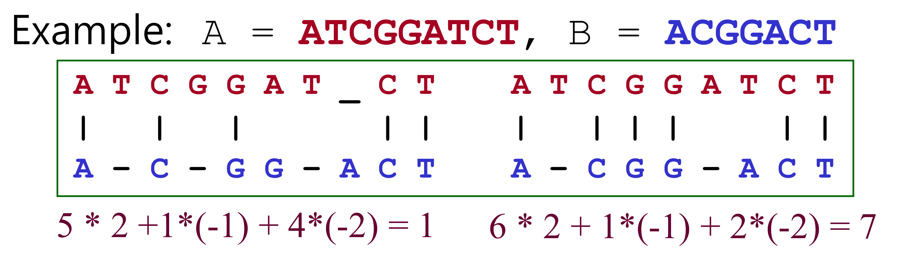 두개의 문자열이 주어졌을 때, score을 최대화하는 gapped alignment를 구하여라.