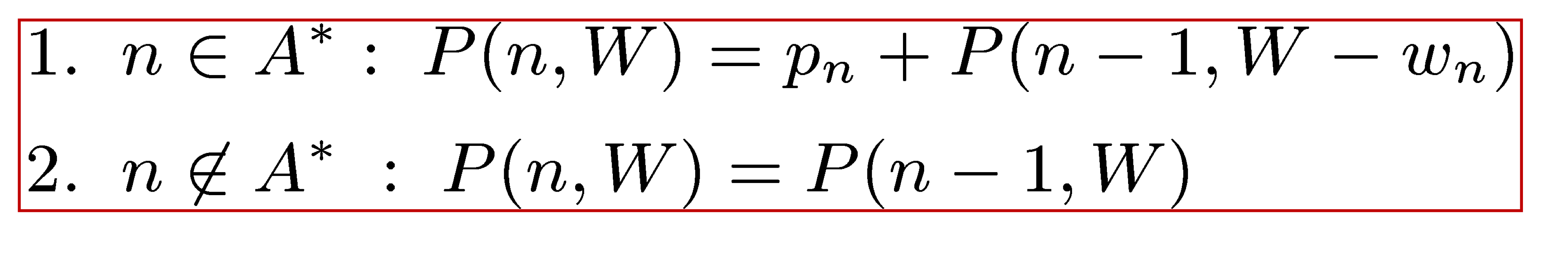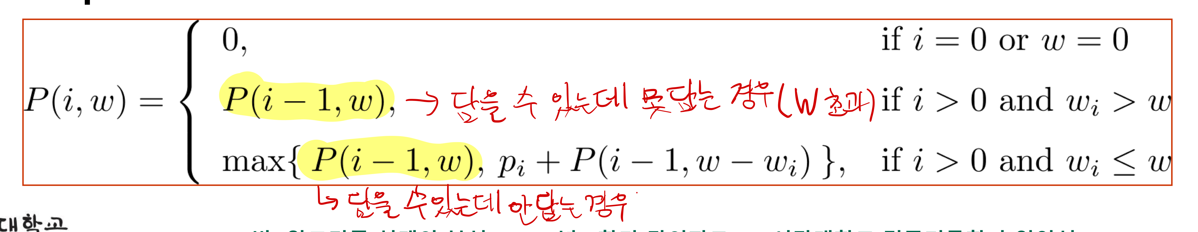 그렇게 되면 위 처럼 두가지로 optimal subset에 포함되는 경우와 포함되지 않는 경우로 모든 경우의 수를 표현 할 수 있게 된다.