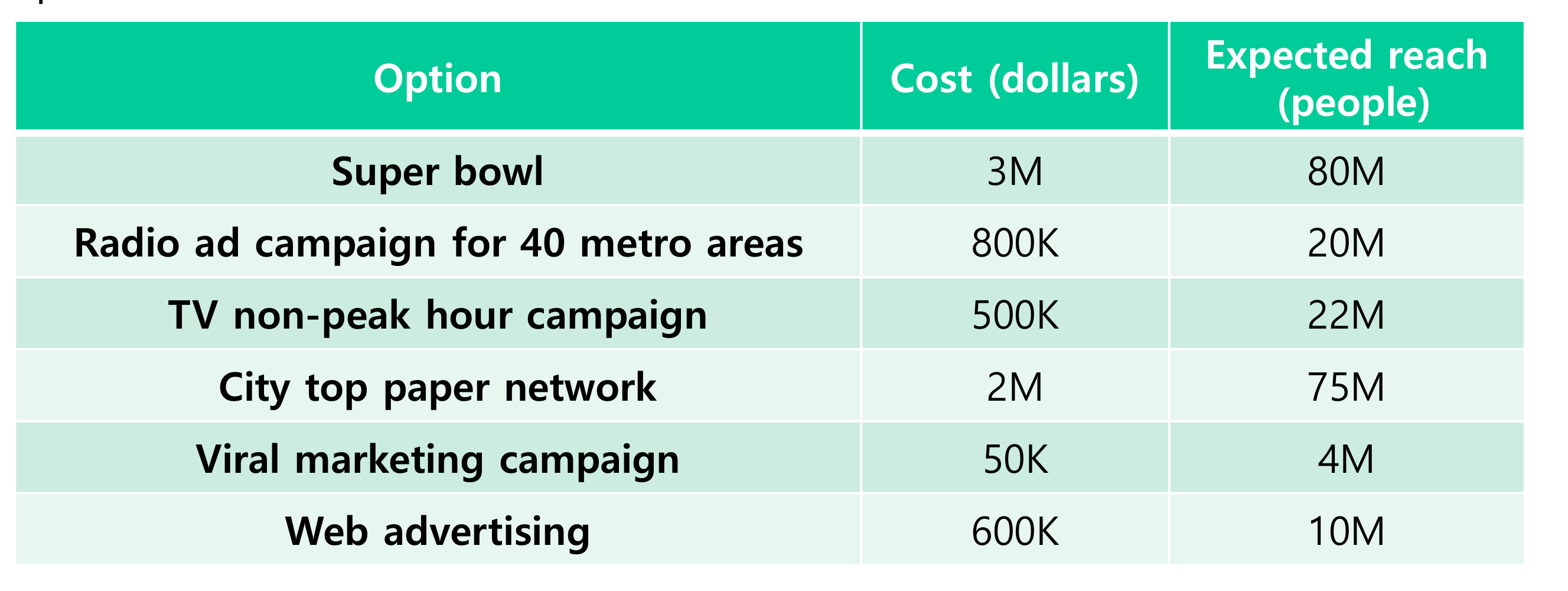 예를 들어 다음과 같은 option이 있고 이에 대한 Cost 와 Expected reach가 있다고 하자. 주어진 예산이 W가 될 것이고, Cost는 정의에서 w가 될 것이고 Expected reach는 p가 된다.