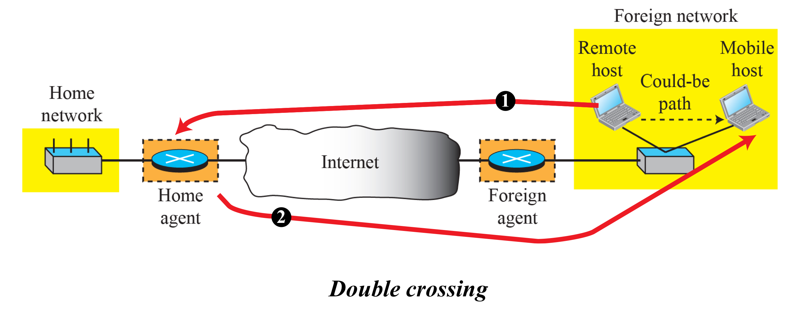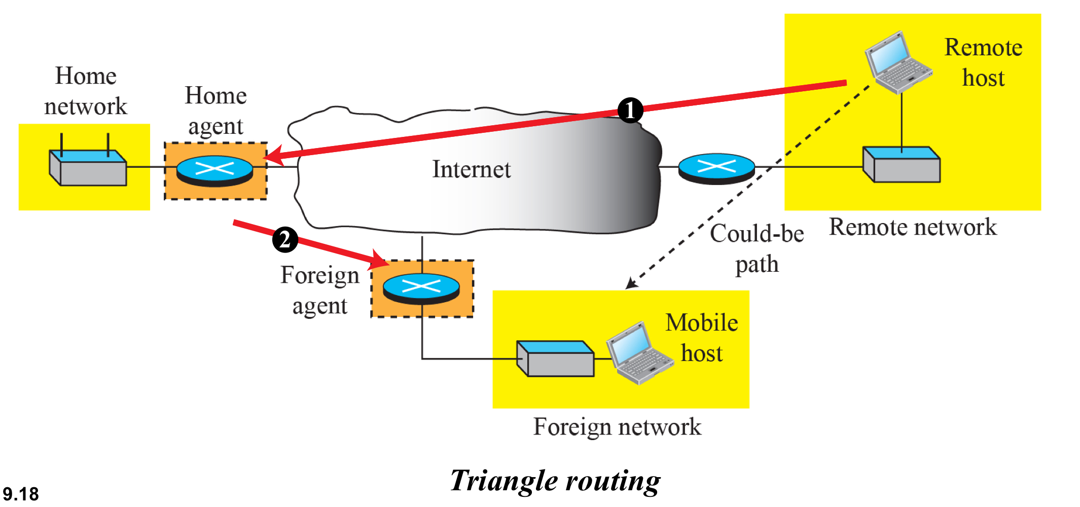 Mobile IP를 포함하는 communication은 inefficient할 수 있다. Inefficiency의 수준은 severe 또는 moderate 할 수 있는데, moderate한 경우는 triangle routing이라고 한다.
