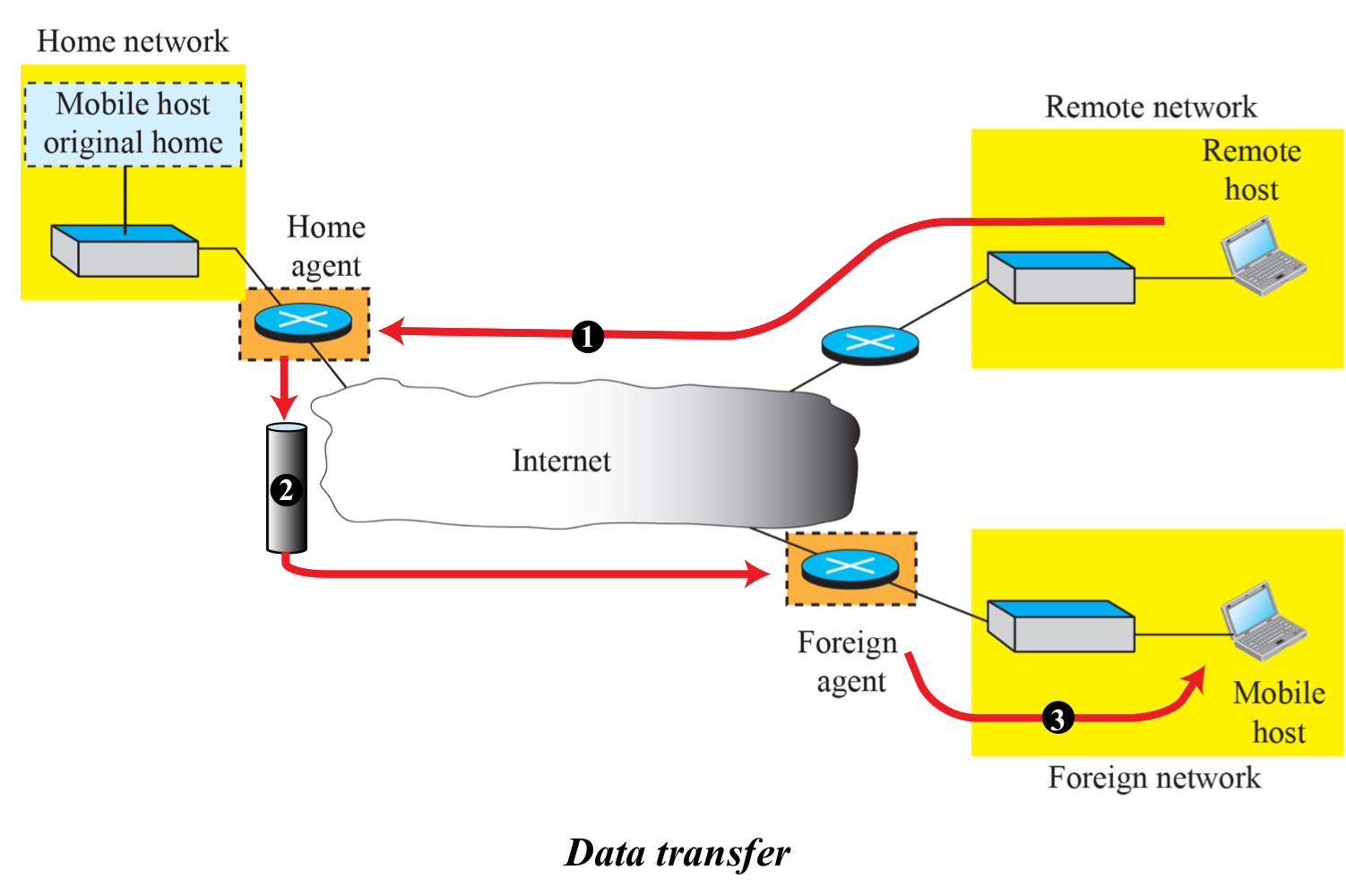 - Remote host와 communicate하기 위해서는 mobile host는 agent discovery, registration, data transfer 3단계를 거쳐야 한다.