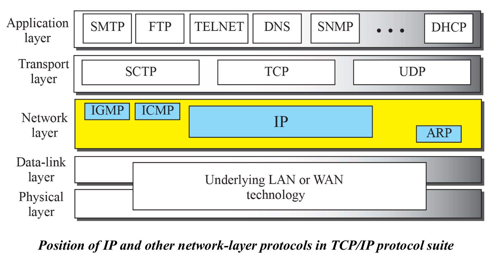 - Main protocol은 IPv4로 packetizing, forwarding 그리고 packet의 delivery에 책임이 있다.