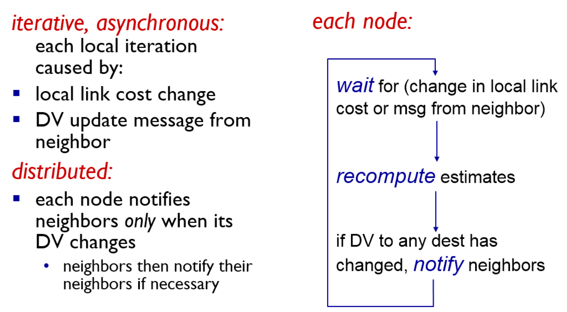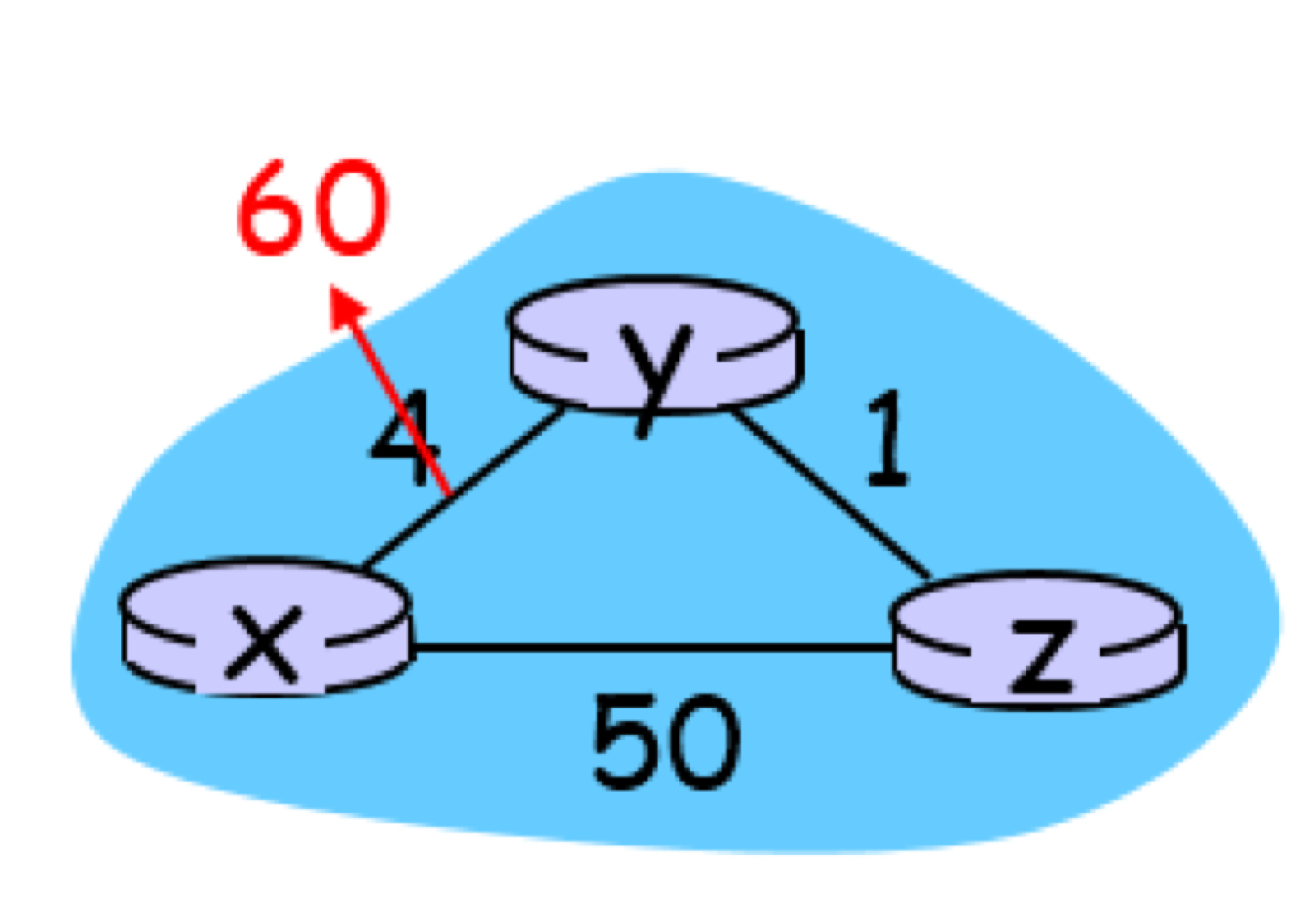- z가 x로 갈 때, y를 통한 경로보다 x로 바로 가는 것이 cheap하다는 것을 깨달을 때까지 44번의 반복이 발생 -> 'count to infinity' 문제