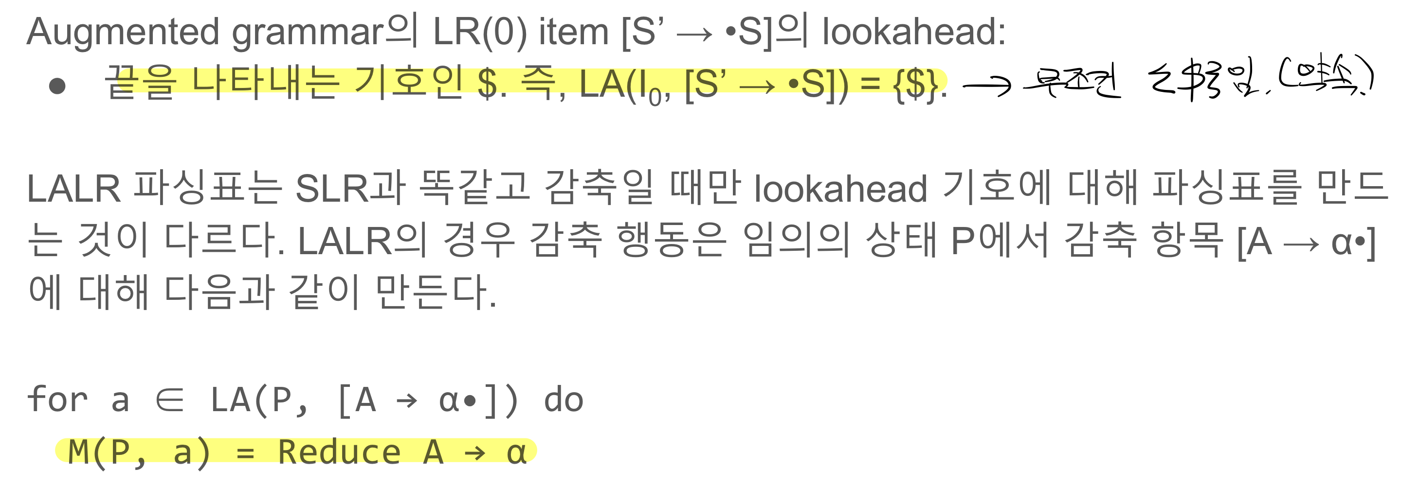 - Reduce action은 lookahead에 의해 결정 (LALR)