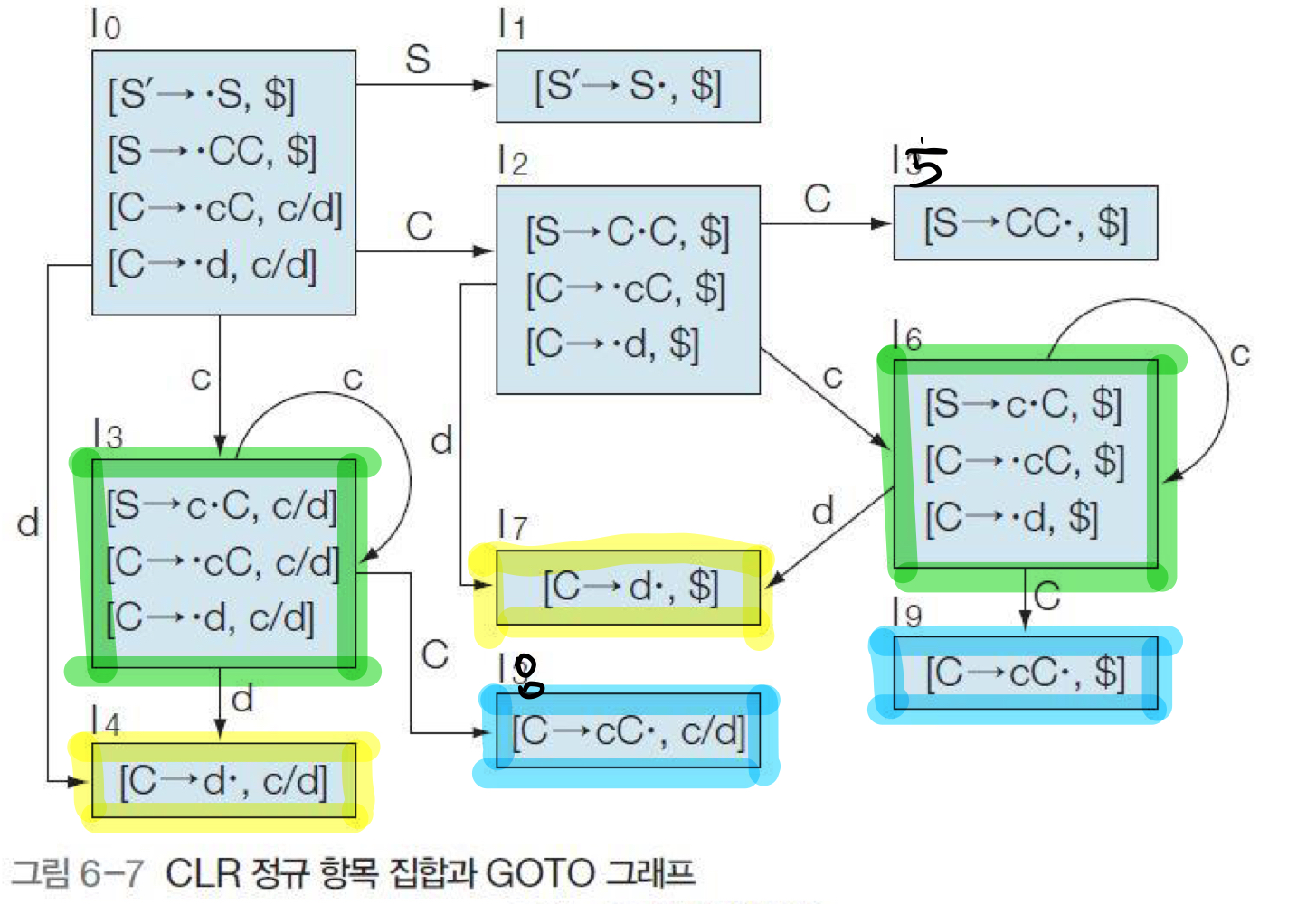 I36, I47, I89 라는 state를 만든다( 같은 코어를 가진 LR(1) item을 묶어서 하나의 state로 만든 것 )