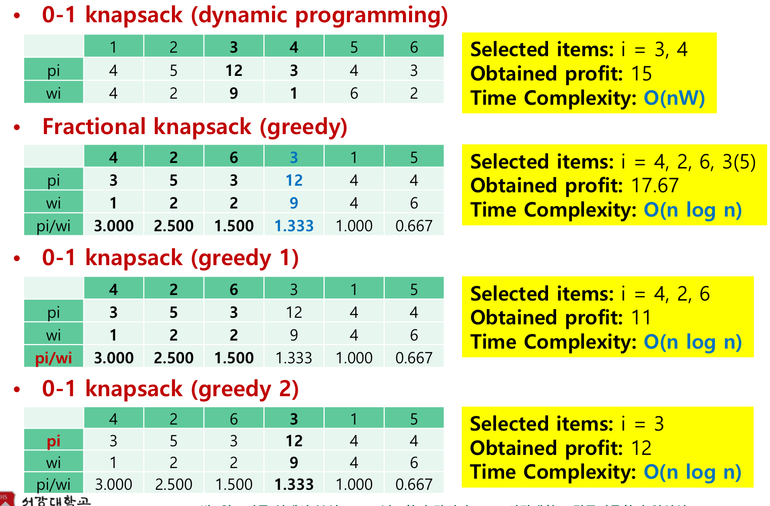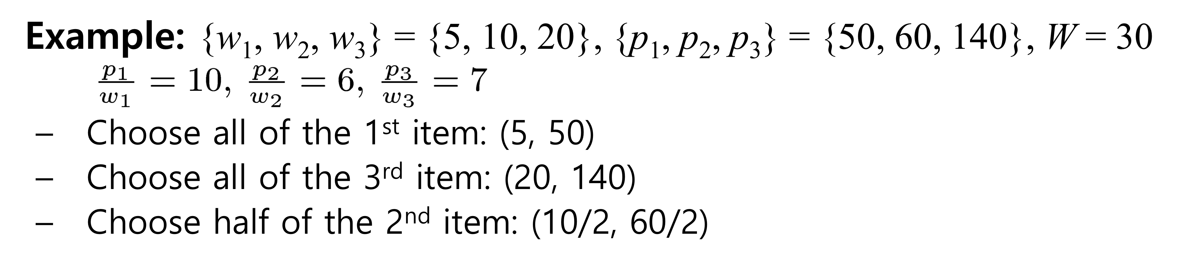 - Pi/Wi를 내림차순으로 정렬한다.(Greedy)