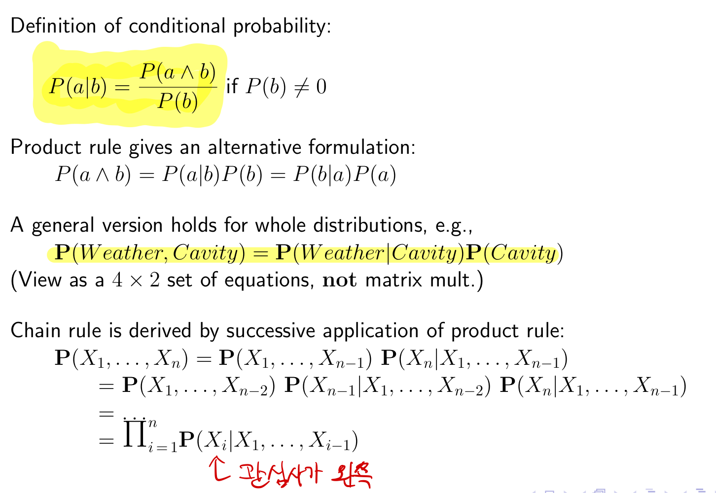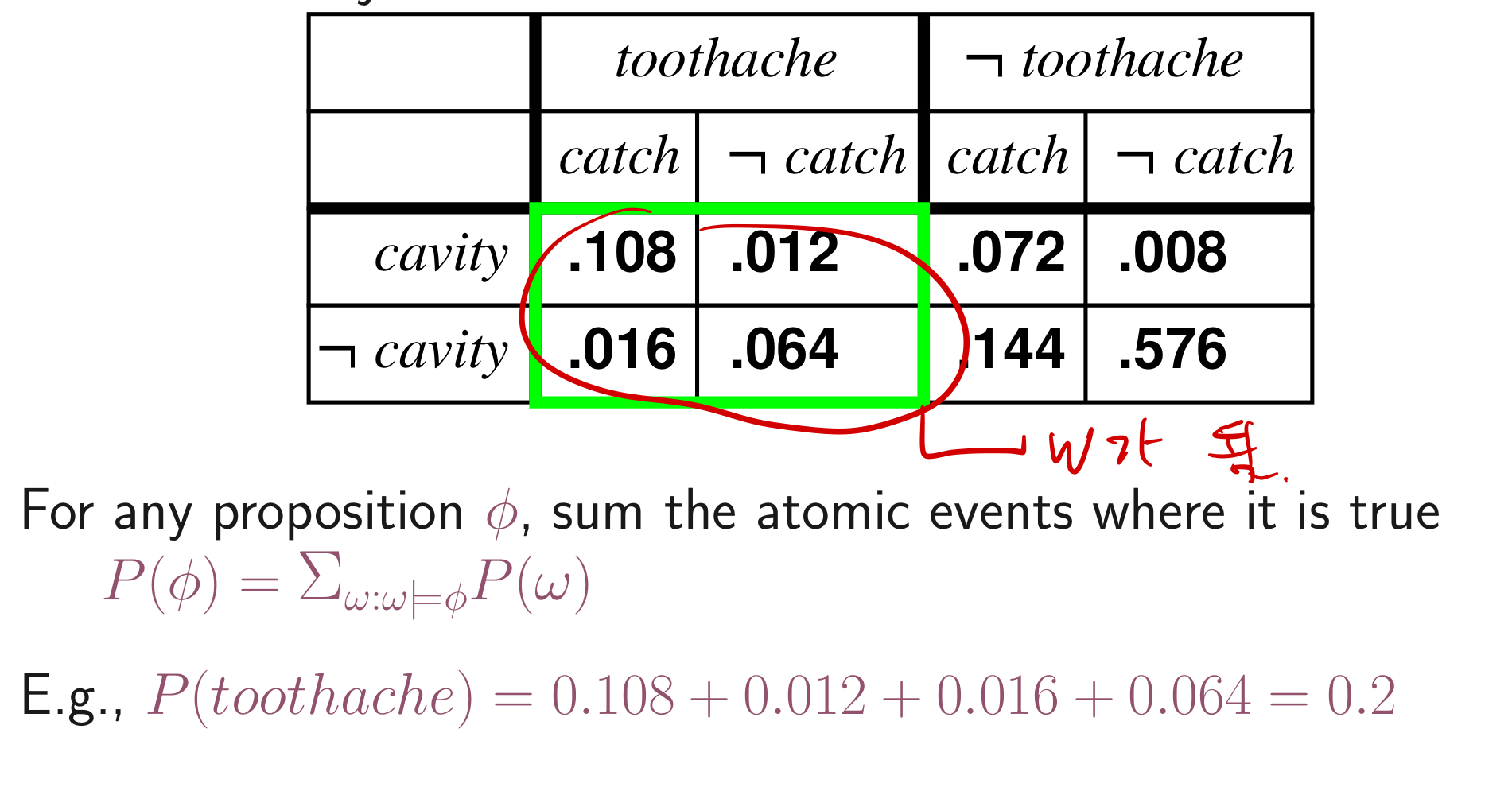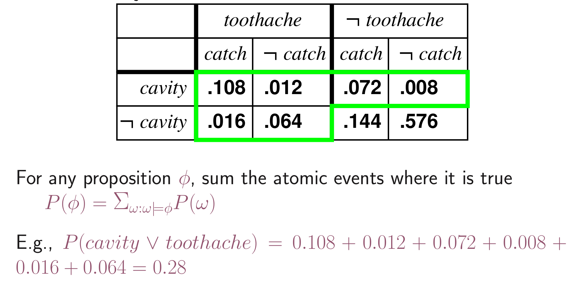 위와 같은 표가 주어졌을 때, P(cavity) = P(cavity,ache) + P(cavity,ache')가 된다.