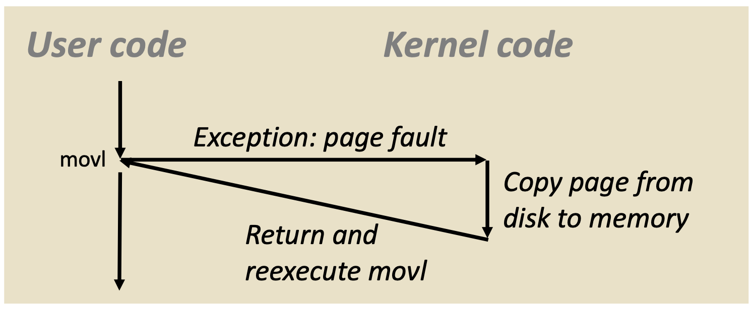 따라서 처음 instruction을 실행 할 때 RAM에 있지 않기 때문에 page fault가 발생하고 제어권을 넘겨받은 OS는 disk에 있는 주소를 RAM에 올리고 제어권을 넘겨 줄 것이다. 다시 해당 instruction을 실행하면 exception없이 실행되게 된다.