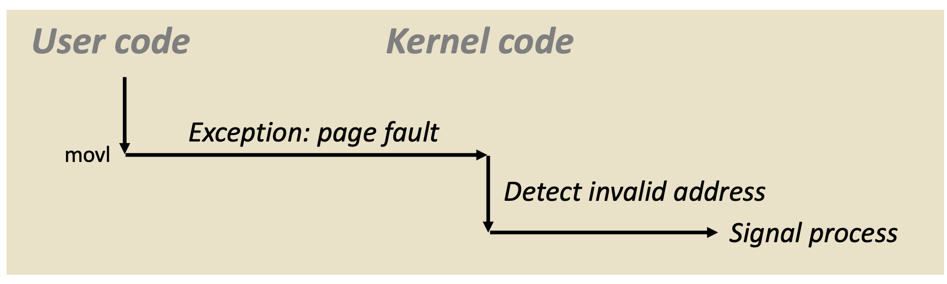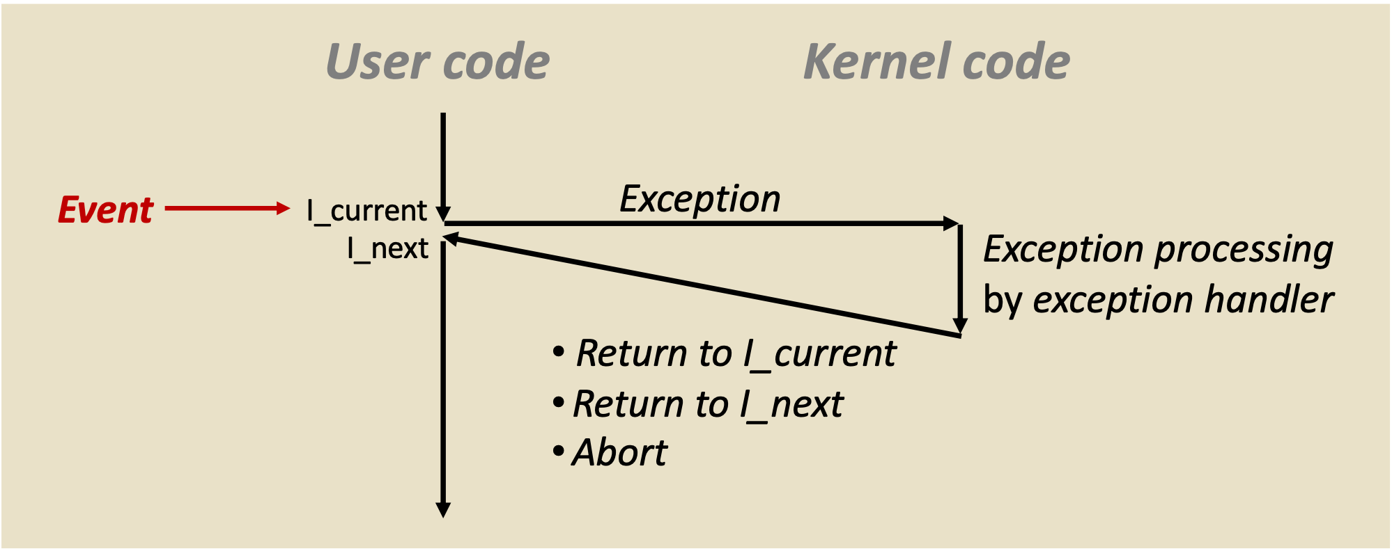 Exception이란 divide by zero, page fault 등과 같은 에러 상황이 발생하였을 때 OS kernel에게 제어권을 넘기는 것이다. 제어권을 넘겨받은 OS는 에러가 나지 않도록 처리를 해주고 제어권을 다시 User에게 넘겨준다.