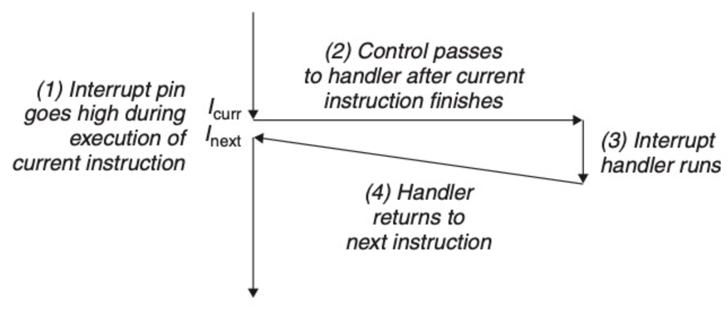 하지만 data가 disk나 network adapter에서 오는 경우, divides by zero가 발생하는 경우, 사용자가 Ctrl-C를 누르는 경우, System에 할당된 시간이 다 된 경우 등 System state에서 control flow를 바꿔야 줘야 하는 상황들이 있다. 이럴 때는 OS에게 제어권을 넘겨줘야 하고 이런 예외적인 control flow를 Exceptional Control Flow(ECF)라고 한다.