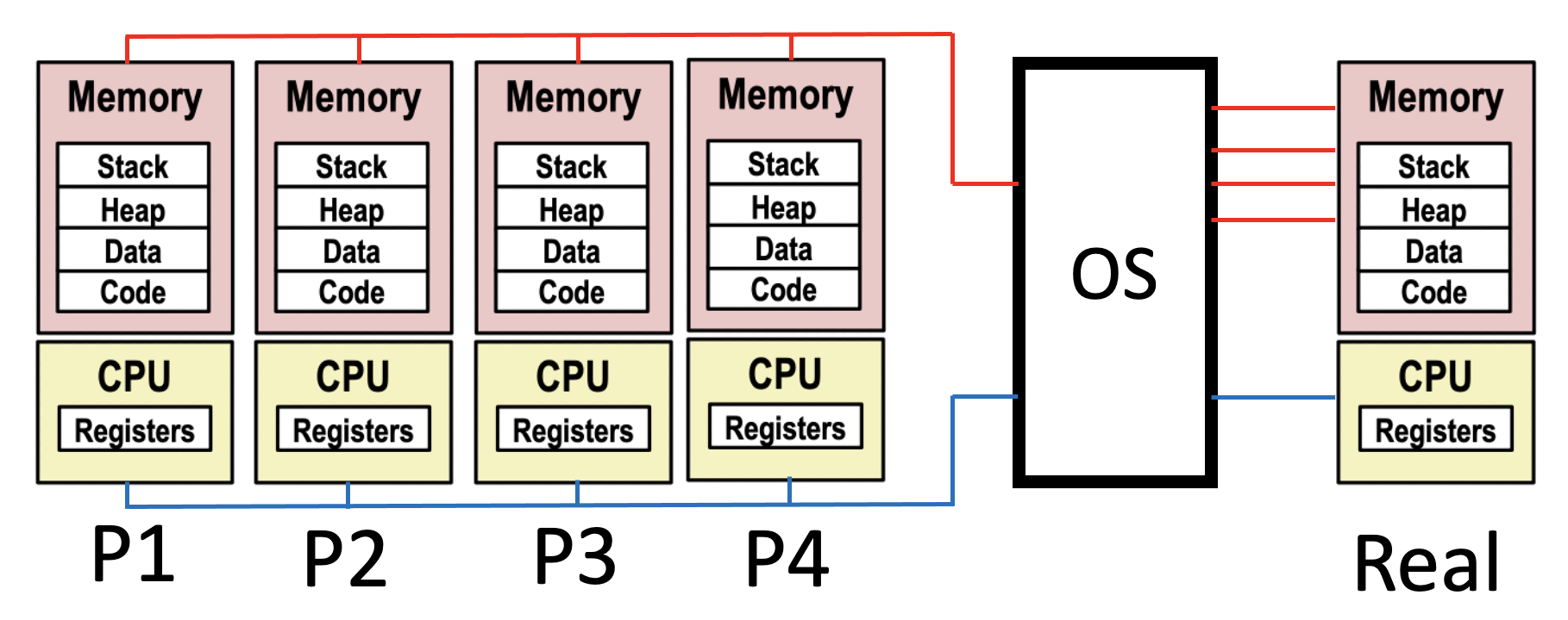 하지만 실제 process가 사용하고 있는 memory는 virtual memory로 실제로는 memory하나에 따로 따로 mapping되어있다.(빨간선)