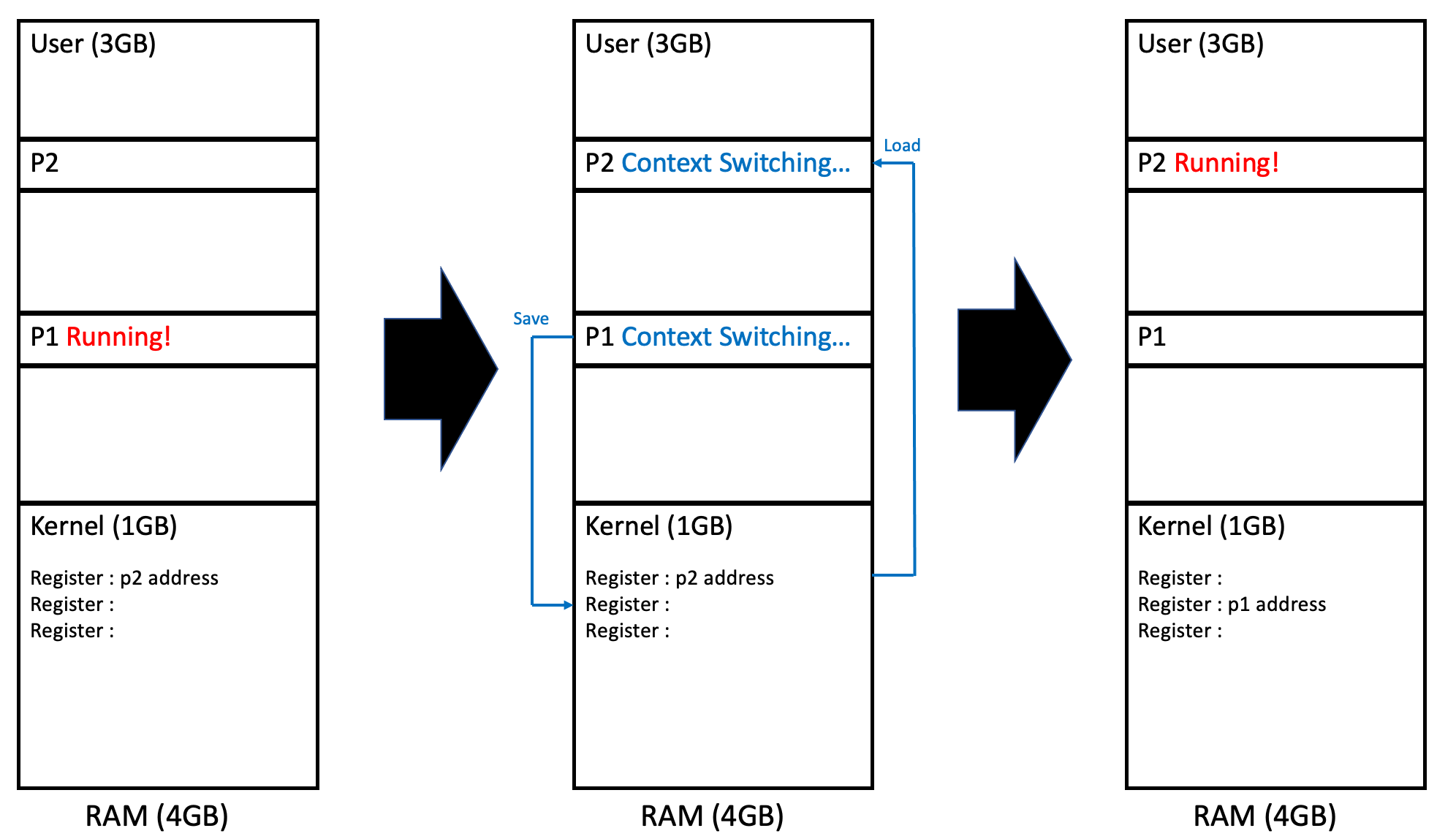 P1이 실행되다가 context switch를 해야한다면 현재 정보들을 register에 save하고 (위 그림에서는 주소라고 표현하였지만 실제로는 훨씬 많은 값들이 저장된다) 다음 실행해야 할 process의 정보를 register에서 load한다.