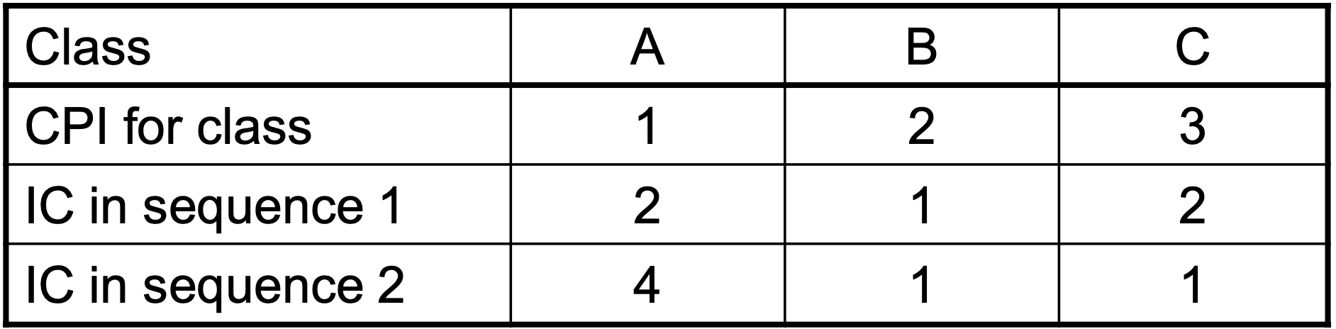 Class A의 instruction을 읽을 때는 1개의 Cycle, Class B는 2개, Class C는 3개의 Cycle이 필요하다는 것이다. ( 한 개의 instruction을 읽을 때 필요한 Cycle은 무조건 양수여야 한다. )