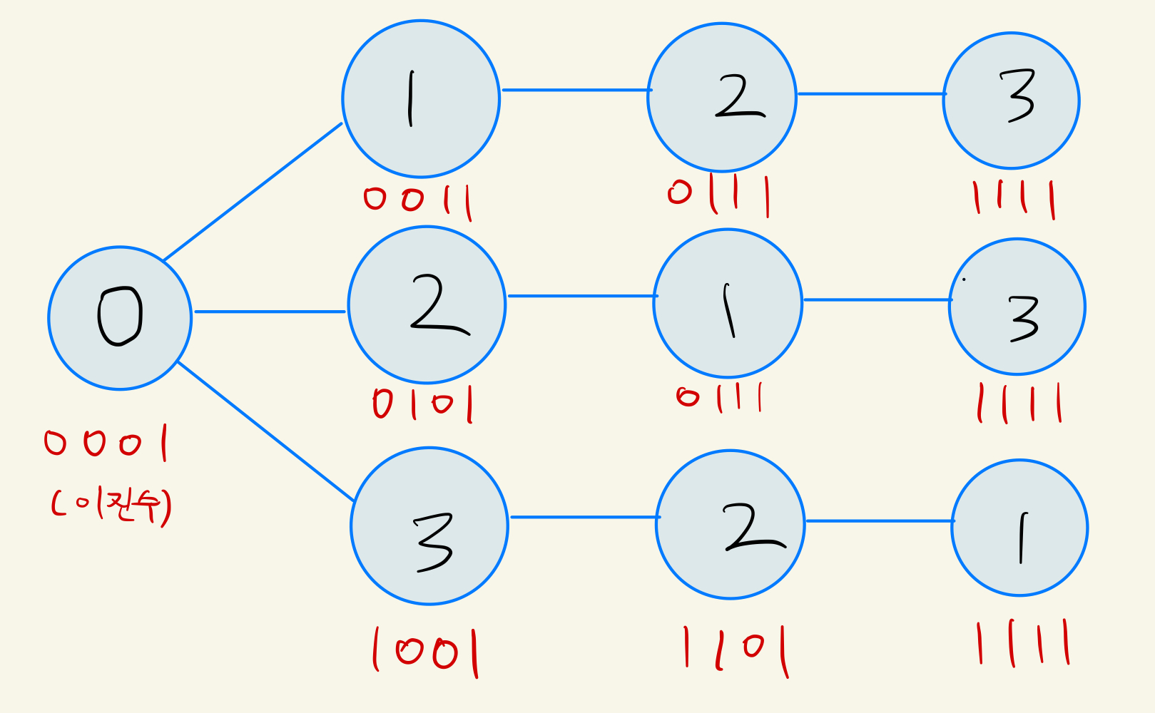 일단 최대 도시의 수가 16개이므로 모든 경로는 (1<<16)-1가지 이기 때문에 비트를 이용하여 표현이 가능하다.