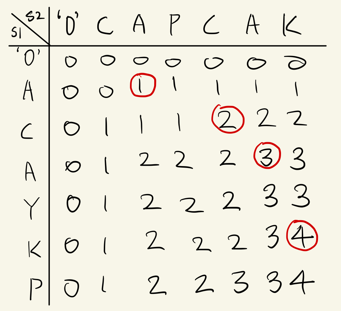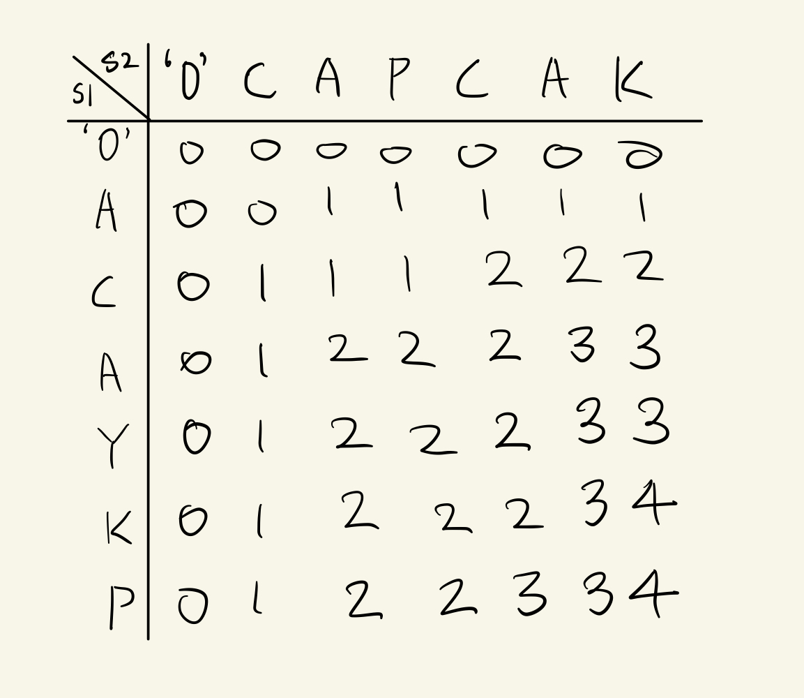주어진 예제 ACAYKP CAPCAK로 dp[i][j]를 모두 나타내면 다음과 같다.